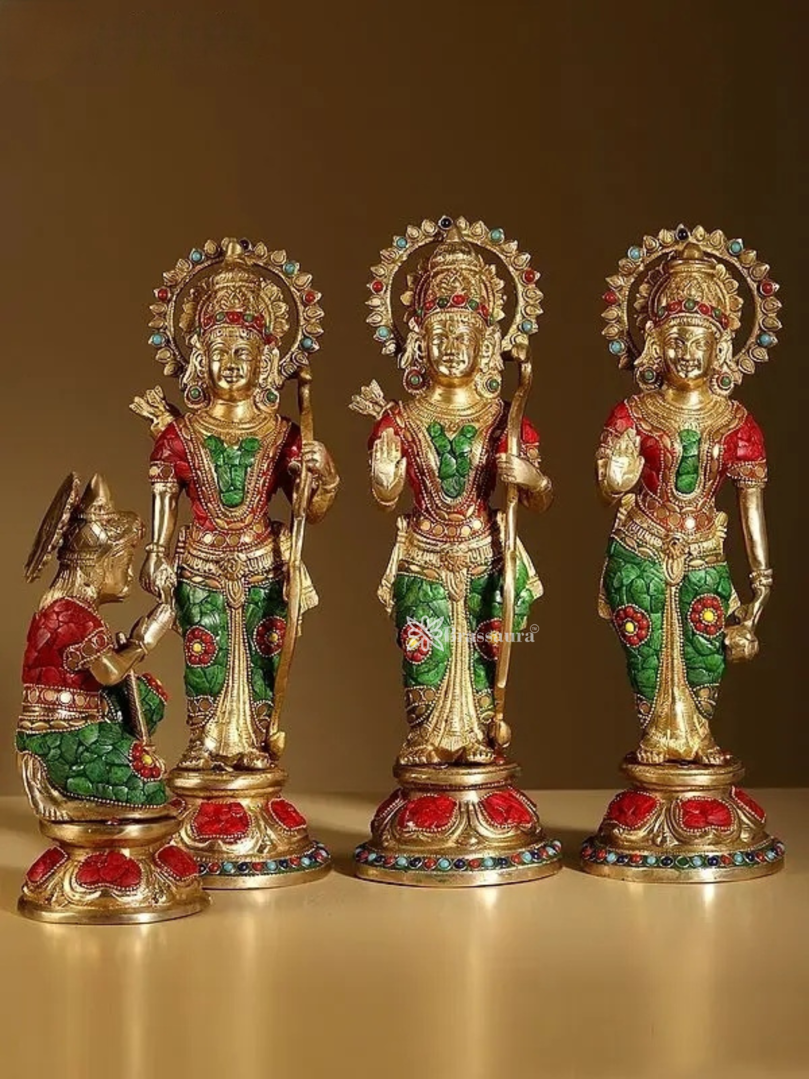 Bring divine blessings into your home with this 13" Shri Ram Darbar Brass Statue, meticulously handcrafted with intricate inlay work. This sacred ensemble features Lord Rama, Goddess Sita, Lakshman, and Hanuman, each idol exquisitely detailed, representing devotion, dharma, and spiritual protection. Ideal for home temples, pooja rooms, meditation spaces, or as a meaningful gift.