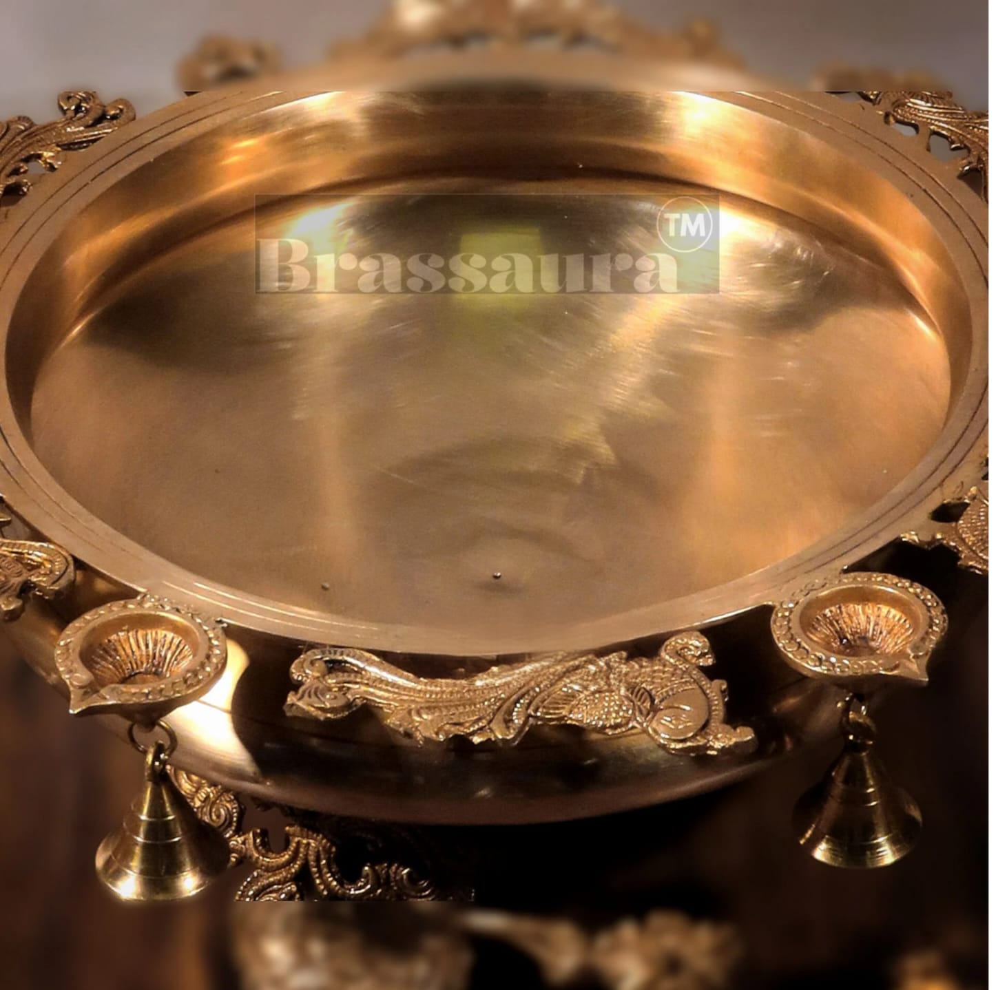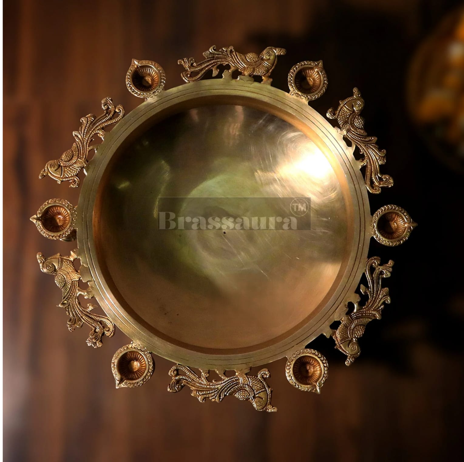 Brassaura™ Magnificent Peacock Brass Urli – 16 kgs, 7.5 Inches Height – Decorative Urli with 6 Diyas & Bells for Home Decor