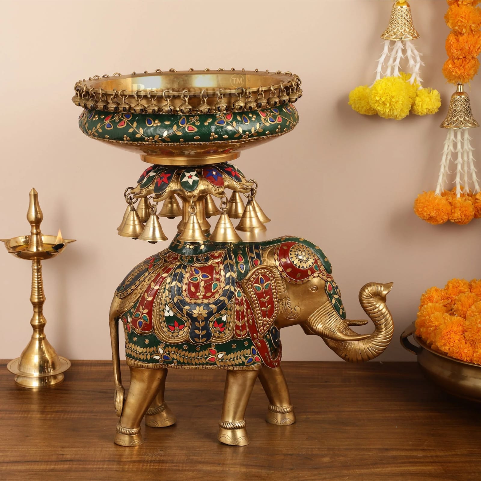 Brassaura™ Brass Elephant Urli with Intricate Stonework – 18.5 kgs, 20.5 Inches Height – Traditional Home Decor