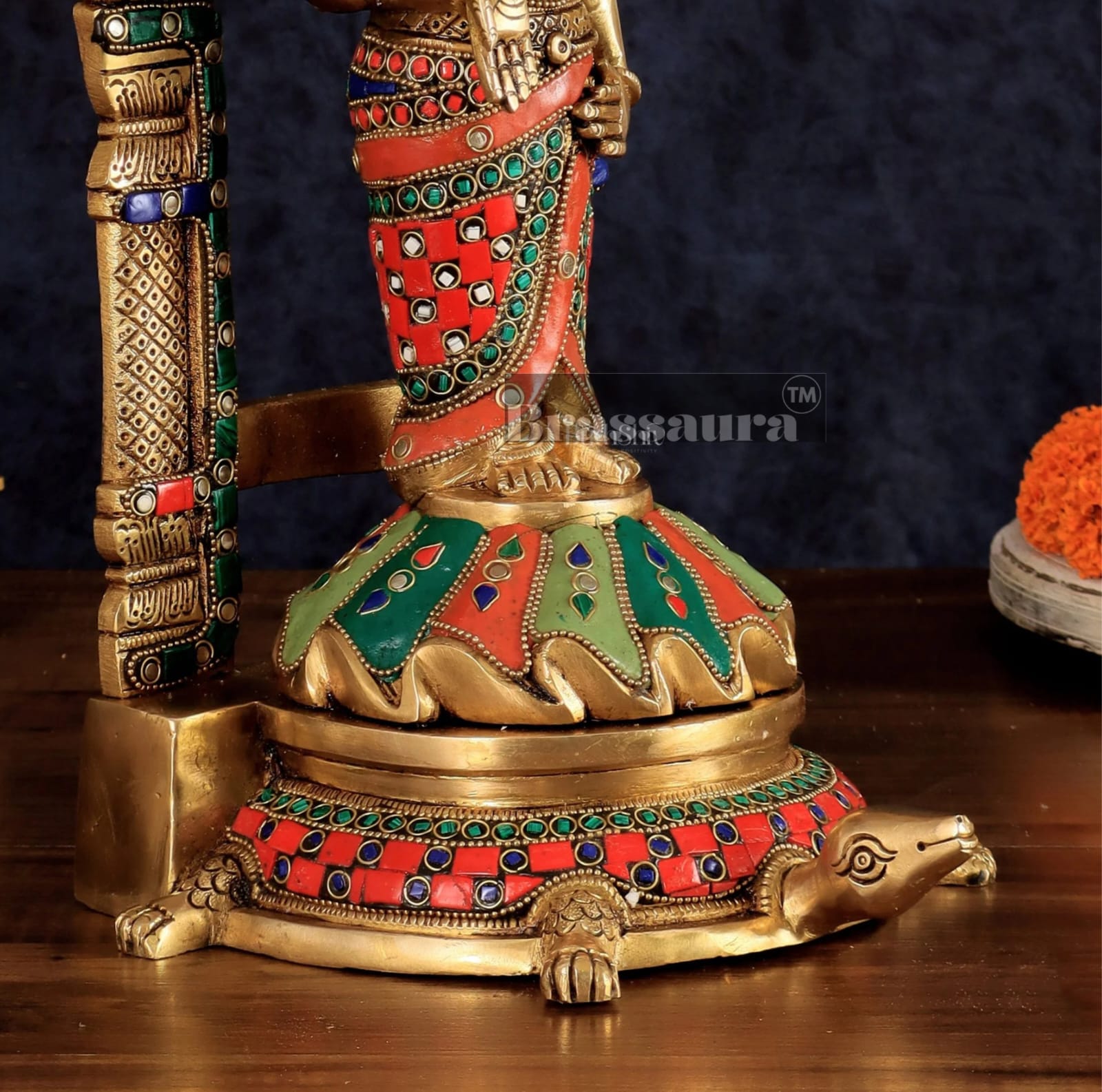 Celebrate the divine presence of Lord Venkateshwara with this finely crafted brass statue, standing gracefully on a symbolic tortoise base. The ornate Prabhavali arch is adorned with intricate engravings, featuring the sacred tilak symbol “Namaha” on the forehead, enhancing its spiritual charm.