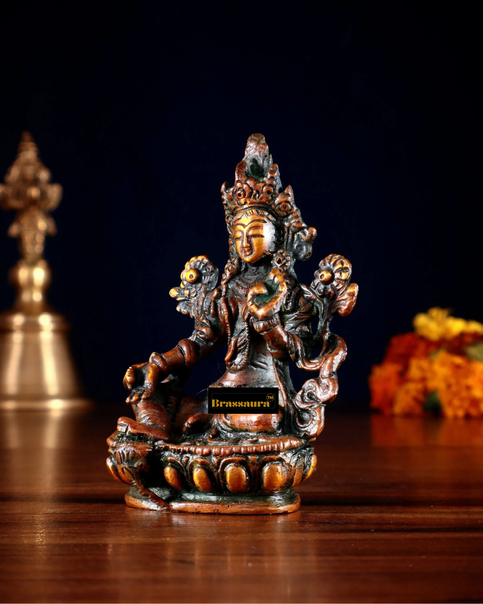 Brassaura™ Green Tara Brass Idol – Height 3.5 Inches | Weight 0.3 Kgs | Nepalese Orange Finish