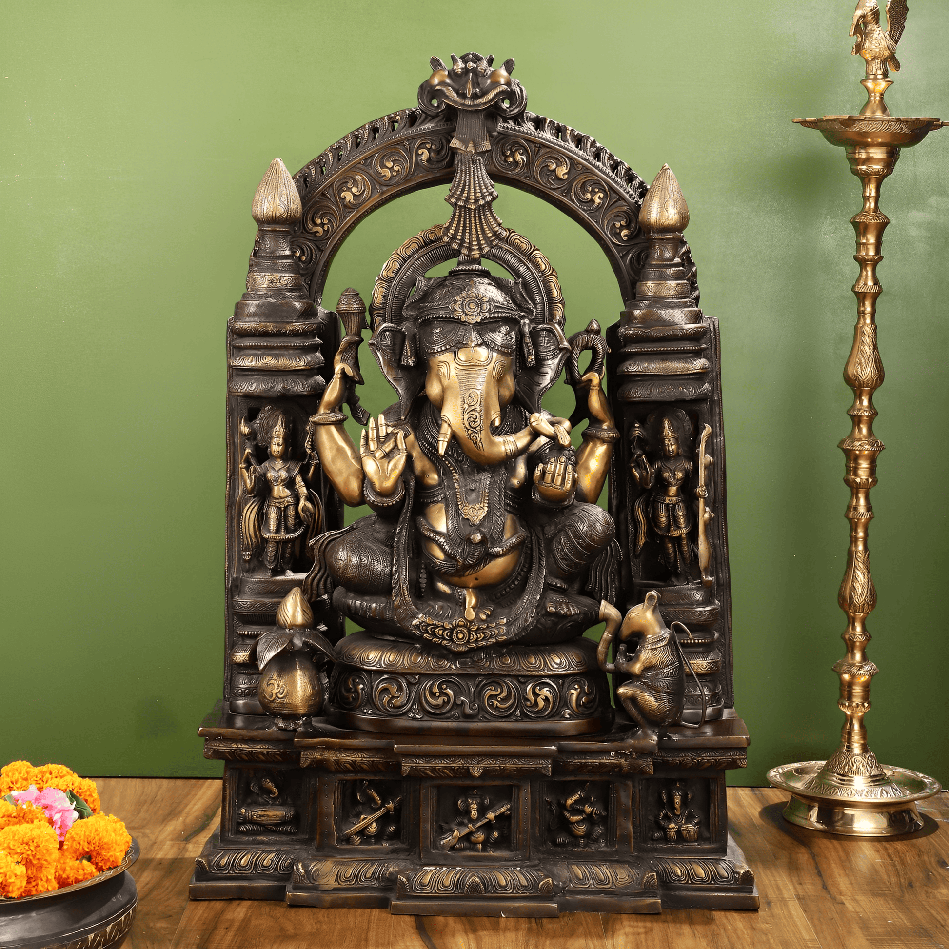 Discover the divine elegance of this handcrafted brass temple sculpture, featuring Lord Ganesha flanked by Goddess Lakshmi and Goddess Saraswati atop a beautifully detailed temple arch. The base is adorned with five intricately engraved musical Ganeshas, making it a majestic centerpiece for your home or temple.