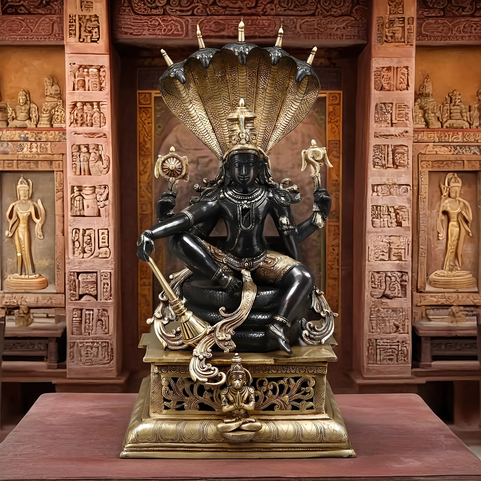 Brassaura™ Superfine Brass Lord Vishnu Idol with Sheshanaag & Hanuman | 29 Inches Height | 35 Kgs Weight | Black & Golden Heat-Treated Finish