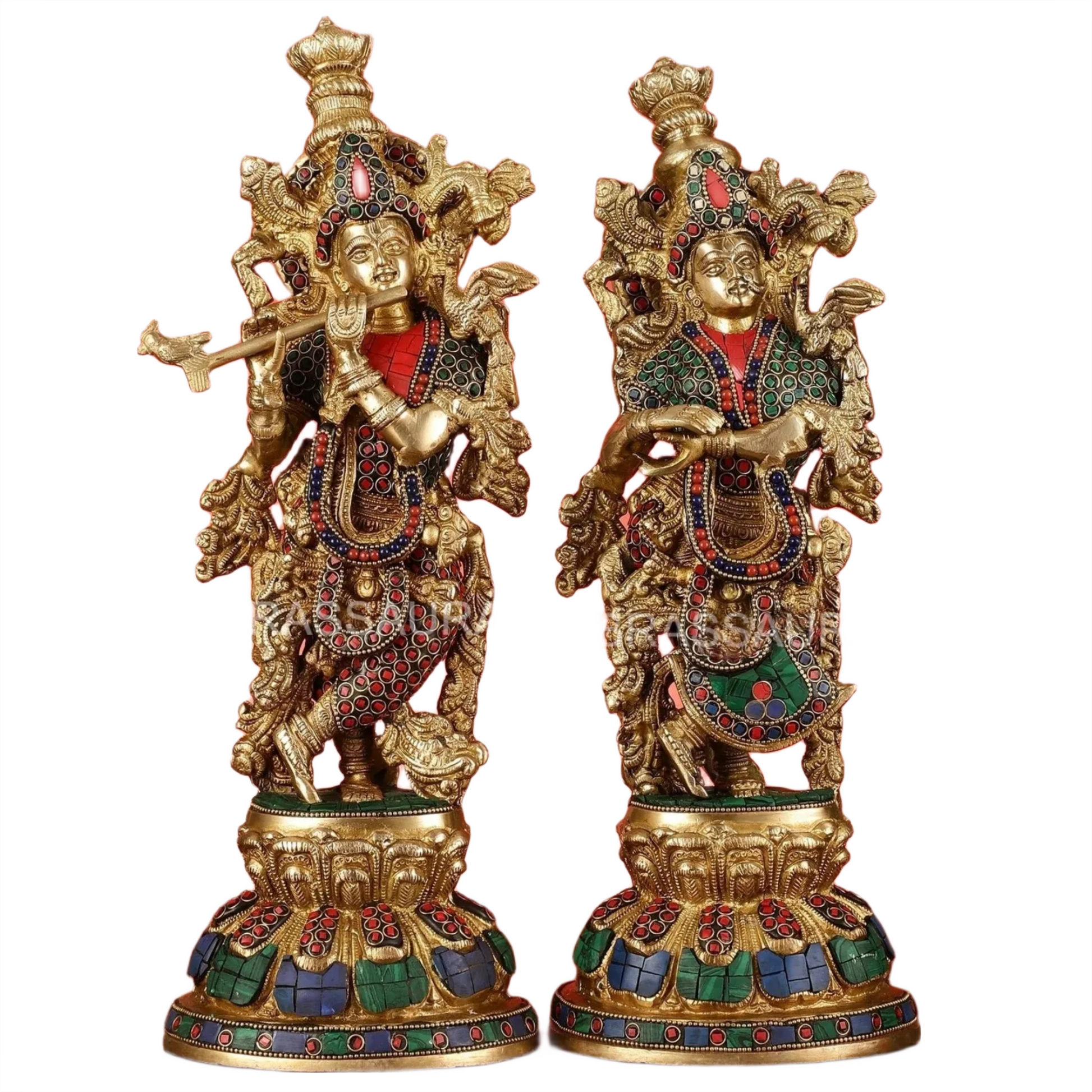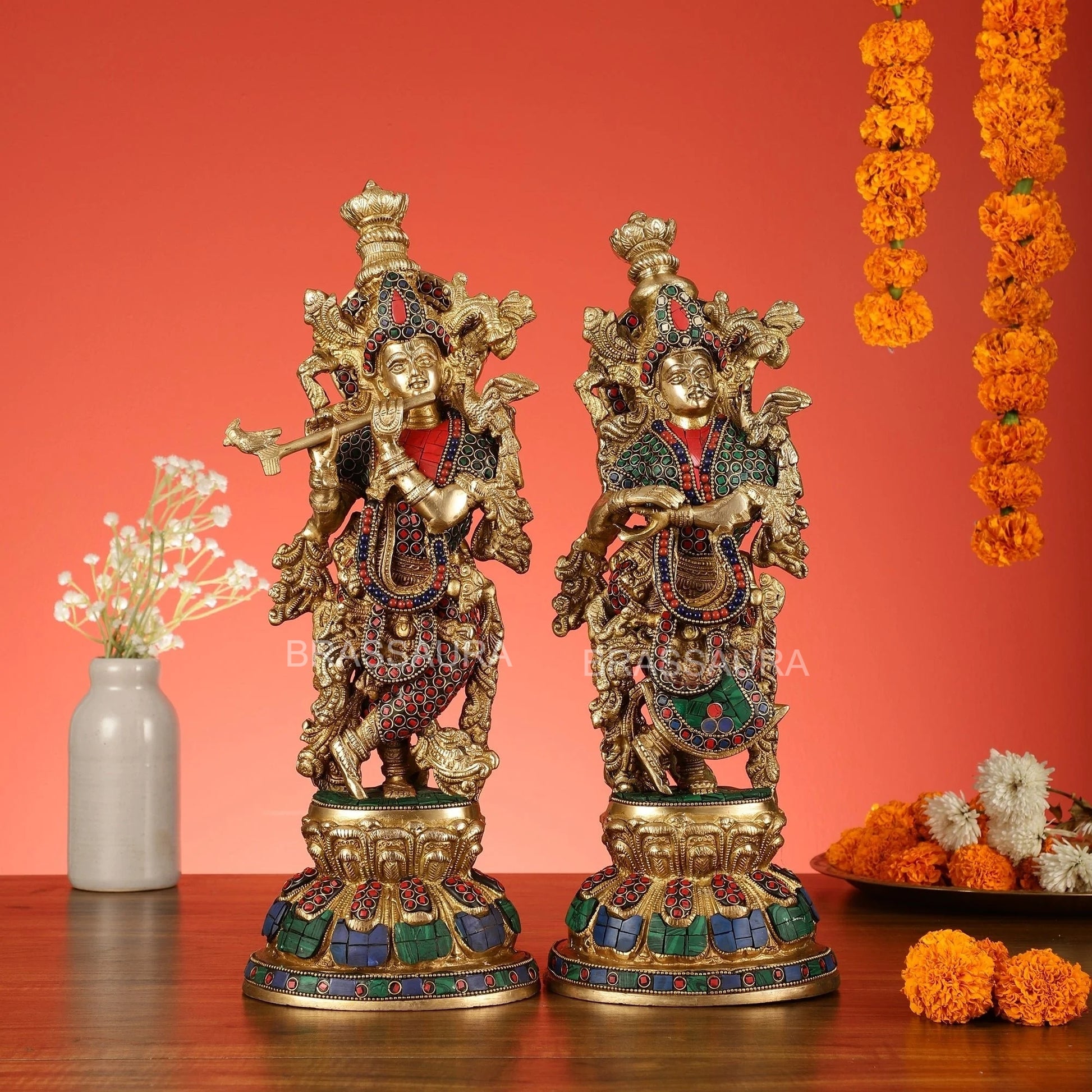 Brassaura™ Brass Radha Krishna Idol Pair with Multicolored Meenakari – Height 15 Inches & Weight 10 Kgs | Elegant Devotional Statue