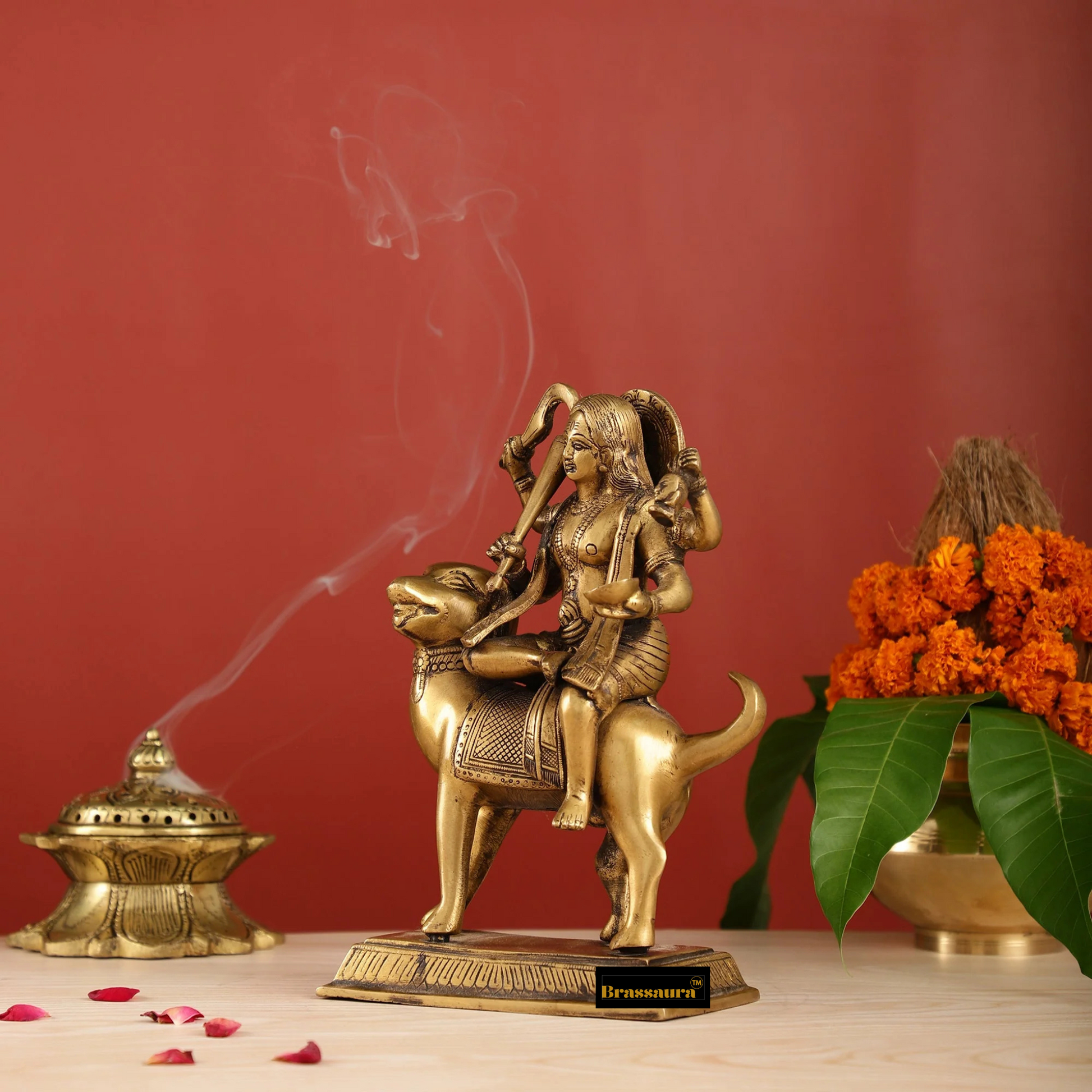 Experience the divine presence of Lord Kaal Bhairava with this meticulously crafted Brassaura™ Pure Brass Idol. Depicting the fierce guardian deity seated on his loyal dog vahana, this exquisite statue radiates strength, protection, and reverence, making it a powerful addition to your spiritual space.