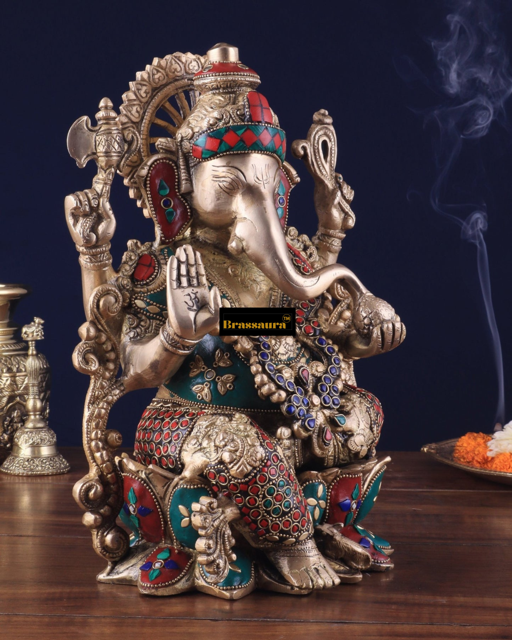 Brassaura™ Handcrafted Pure Brass Ganesha Idol with Meenakari Stonework – 12.25" Height, 8 kg – Lotus Base Masterpiece
