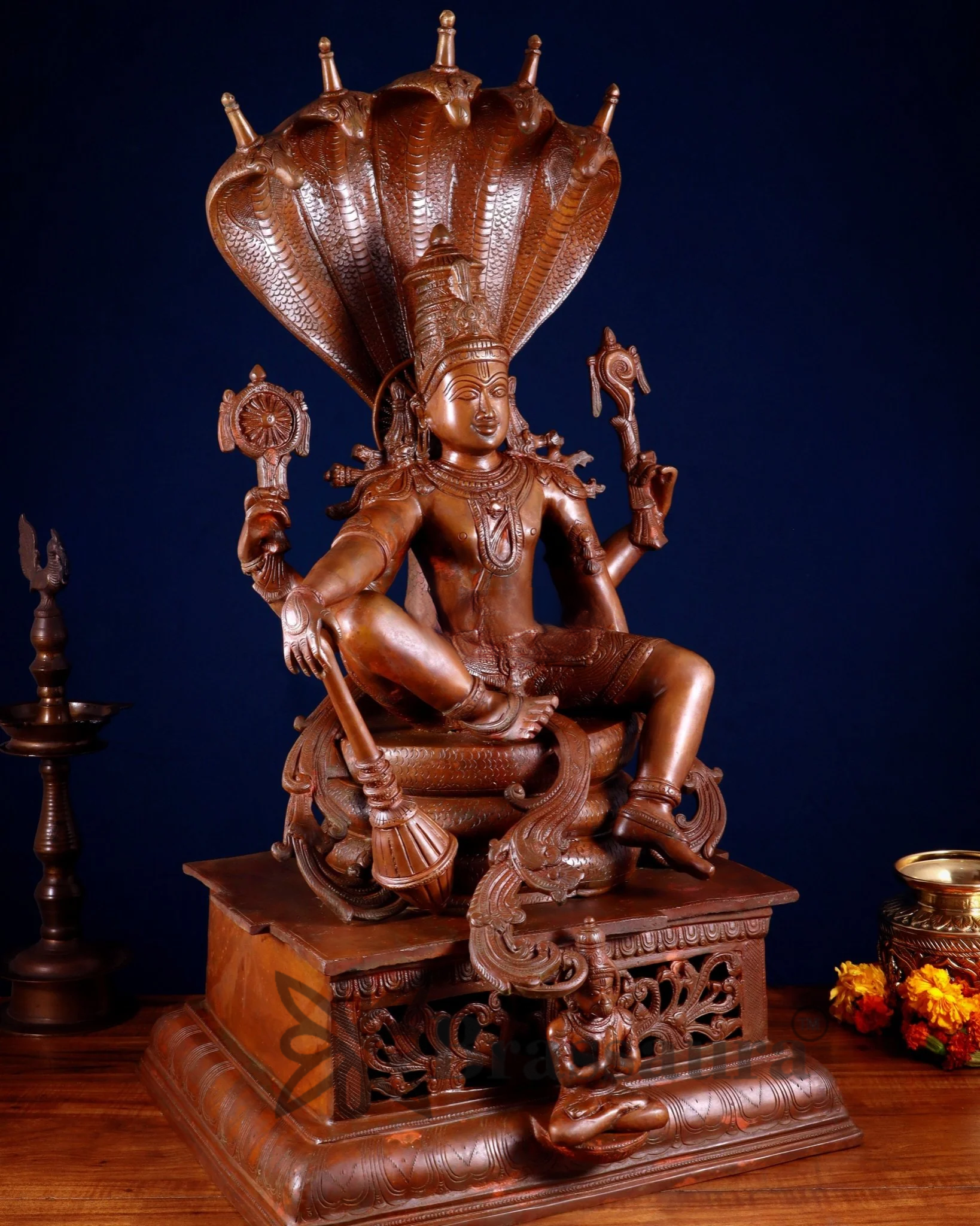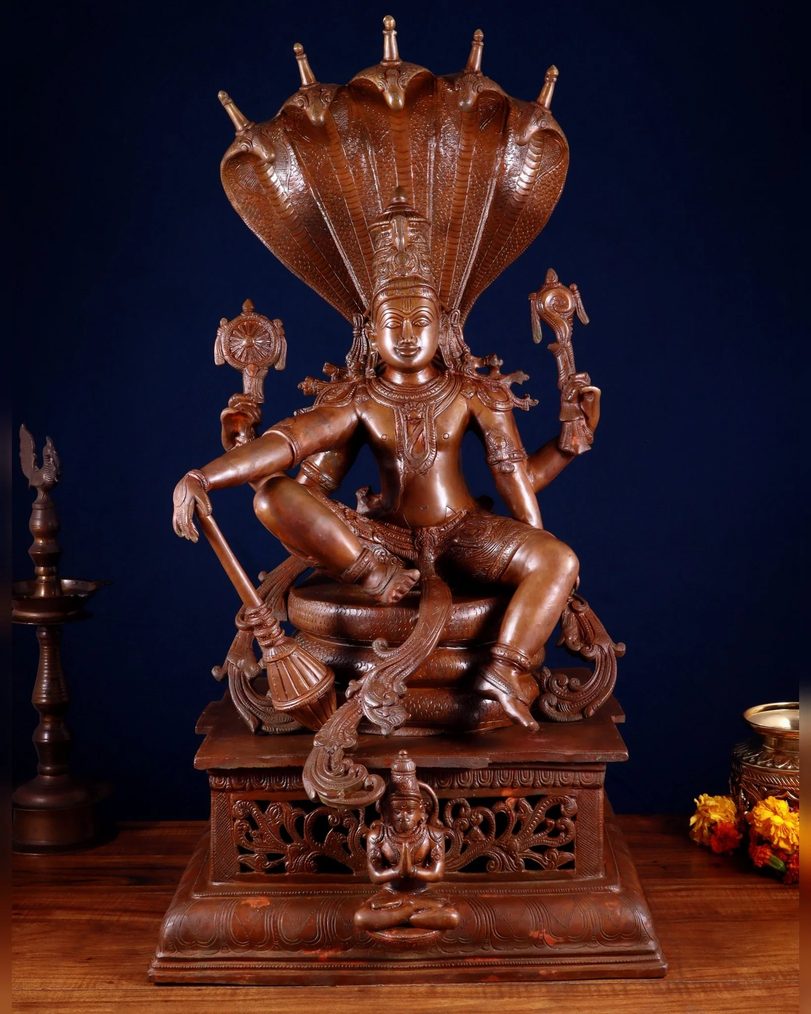 Brassaura™ Magnificent Brass Lord Vishnu Statue Seated on Engraved Pedestal with Sheshanaag and Hanuman | 29 Inch Height | 35 KG Weight | Chola Bronze Finish