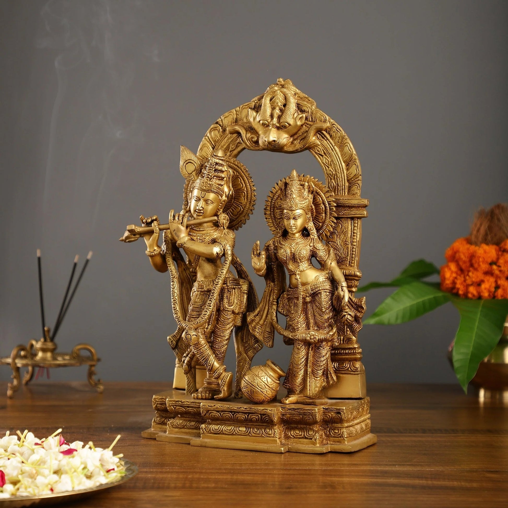 Brassaura™ Handcrafted Radha Krishna Brass Idol with Yali Prabhavali – 14 Inch Height, 7.5 Kg | Divine Flute & Butter Pot Detail