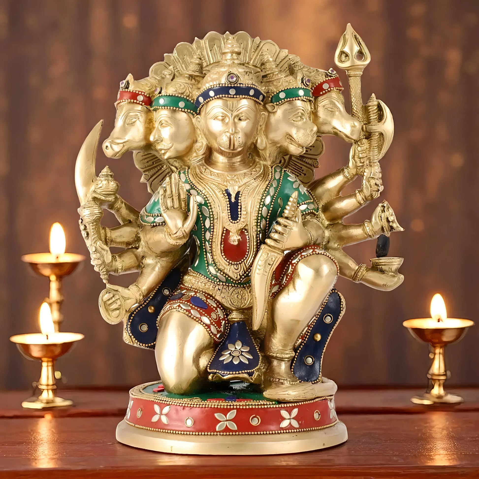 Brassaura™ Brass Panchmukhi Hanuman Idol – Height 11 Inches & Weight 6.6 Kgs | Handcrafted with Natural Stones