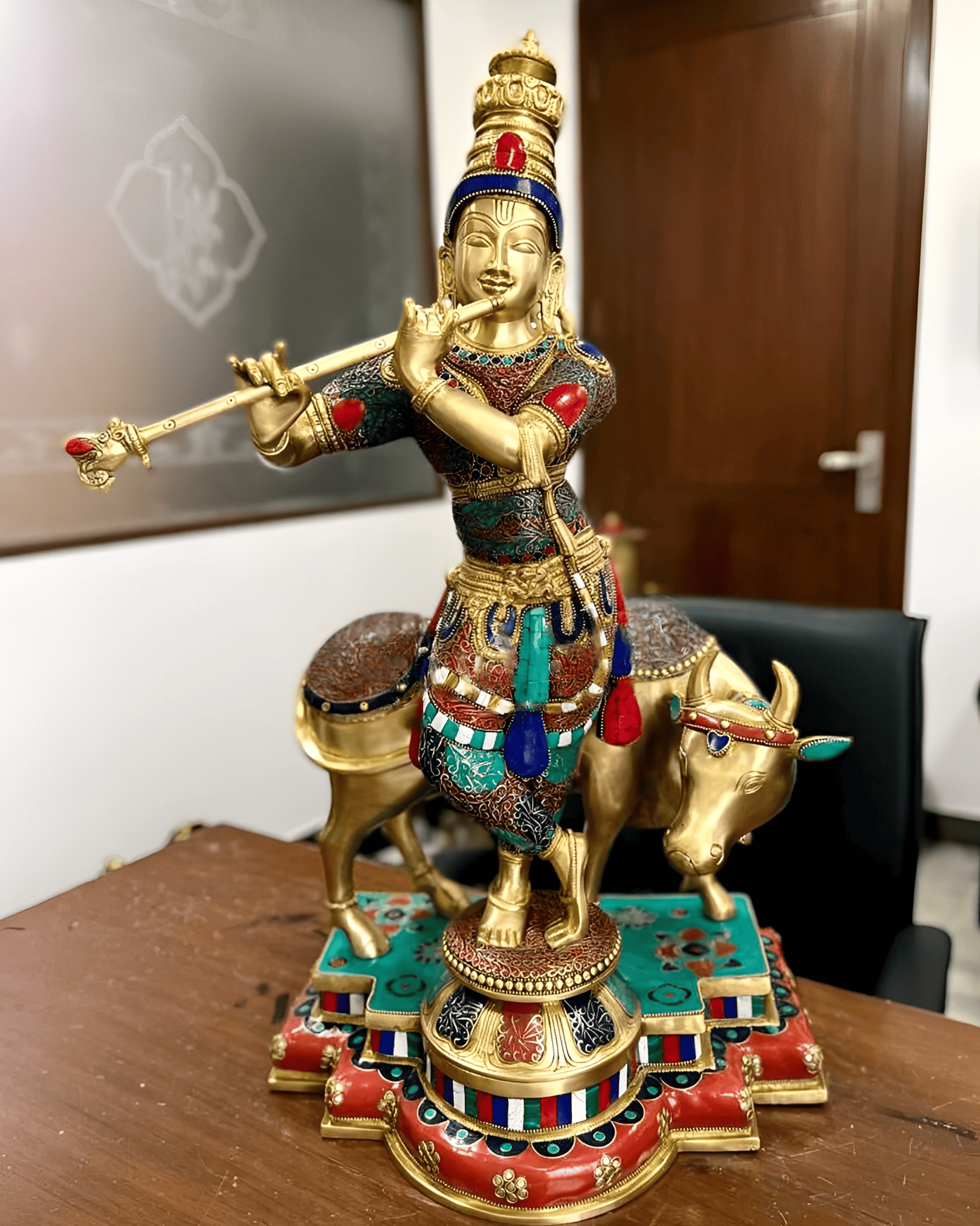 Celebrate the divine charm of Lord Krishna with this handcrafted brass sculpture, adorned with intricate Meenakari stonework and brass nanarola wires. Standing 25.5 inches tall, it beautifully depicts Krishna with a cow, radiating love, devotion, and the rich heritage of Indian craftsmanship — a perfect addition to your home temple or sacred space.