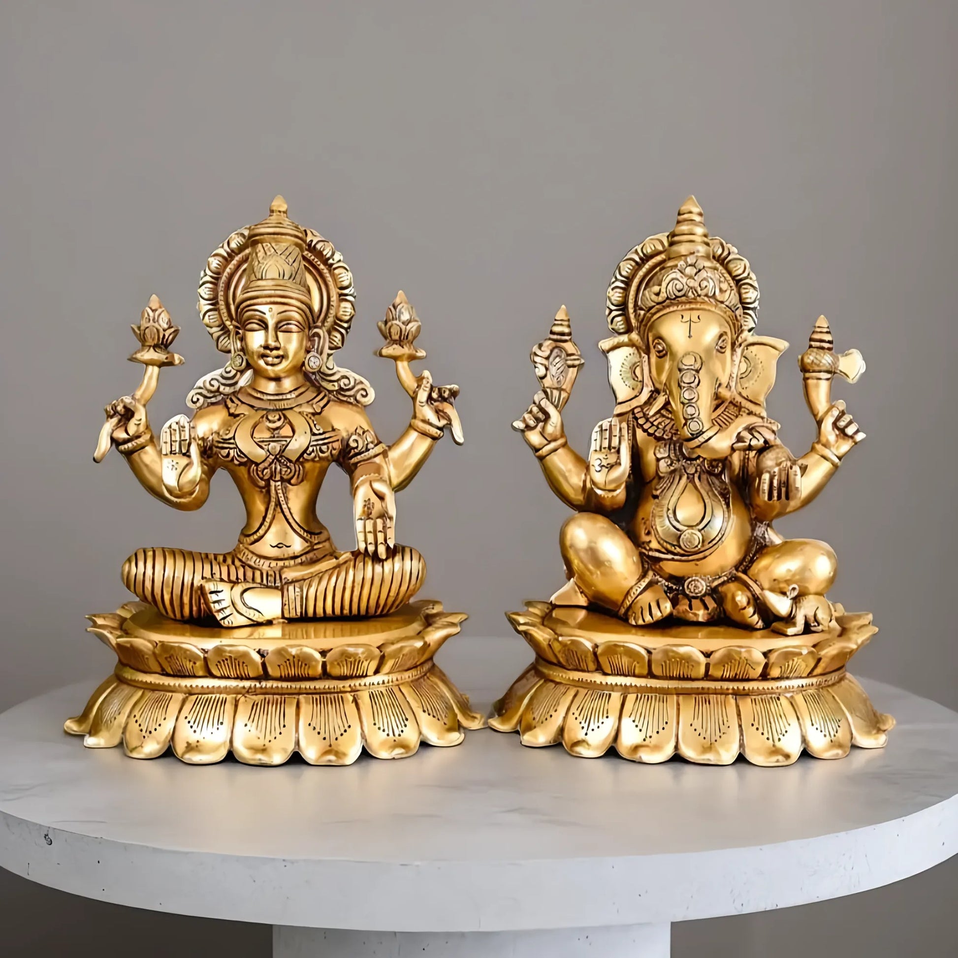 Brassaura™ Lakshmi & Ganesha Brass Idol Set | Superfine Handcrafted Pair | Height 11 Inches & Combined Weight 14.5 Kgs