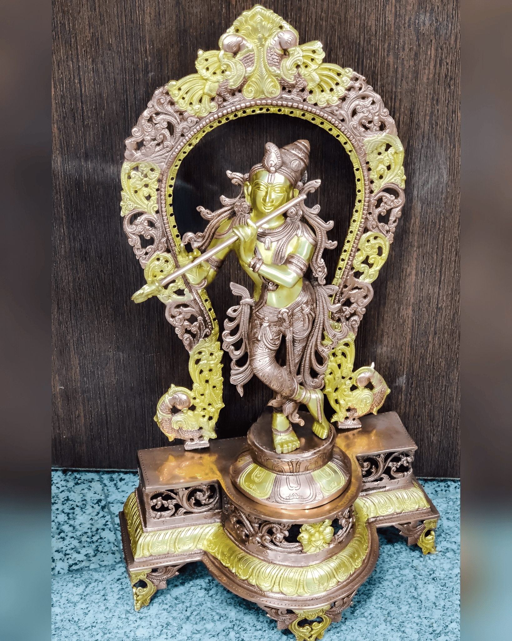 Experience the divine essence of Lord Krishna with this superfine brass statue, featuring an intricately detailed Prabhavali frame and a large platform base. Standing 31 inches tall, it beautifully captures Krishna’s musical grace and captivating presence, radiating elegance, devotion, and spiritual charm — a perfect centerpiece for your home temple or sacred space.