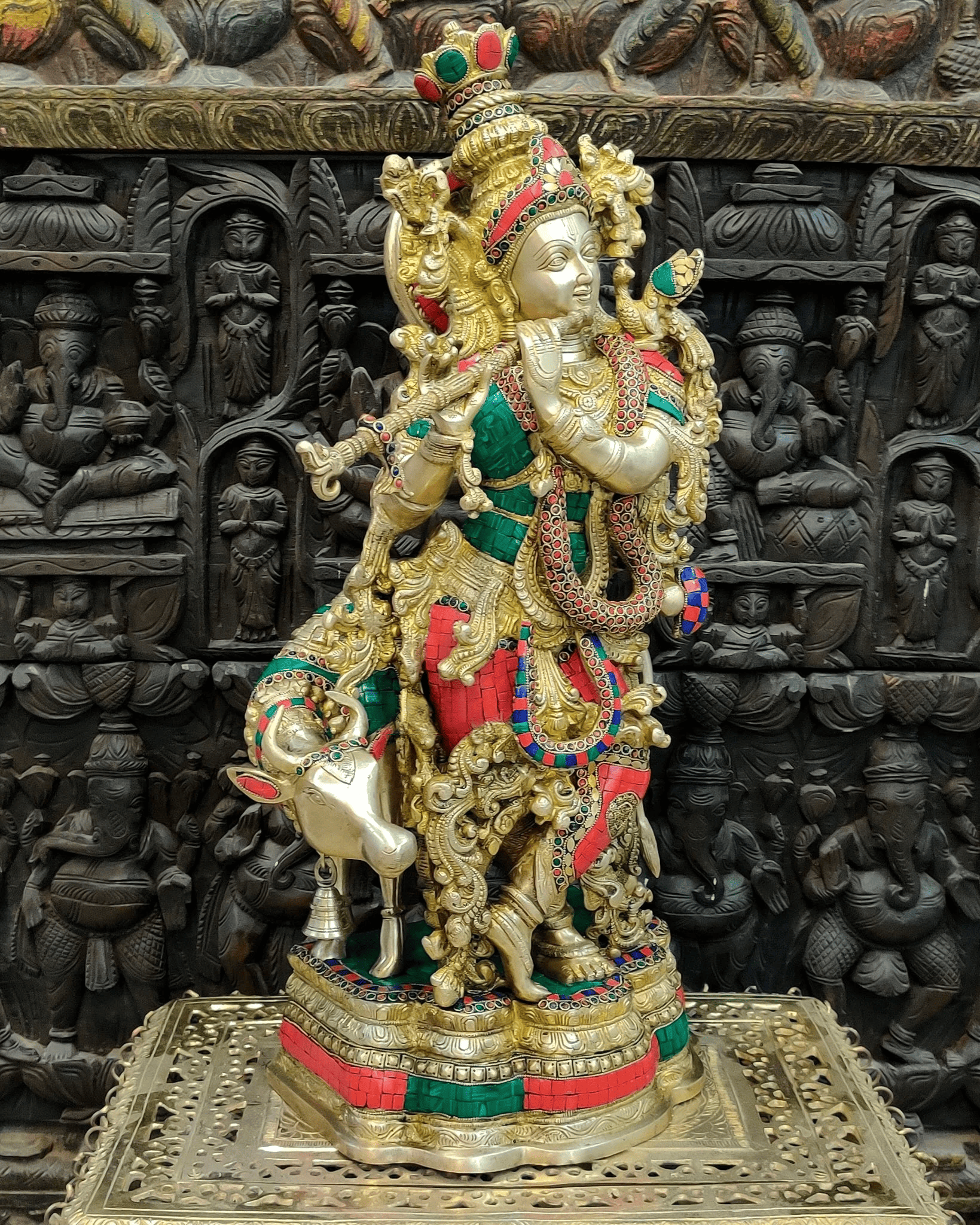 Brassaura™ Krishna with Cow | Pure Brass with Meenakari Ring & Stonework | Height 26.5 Inches & Weight 26 Kgs