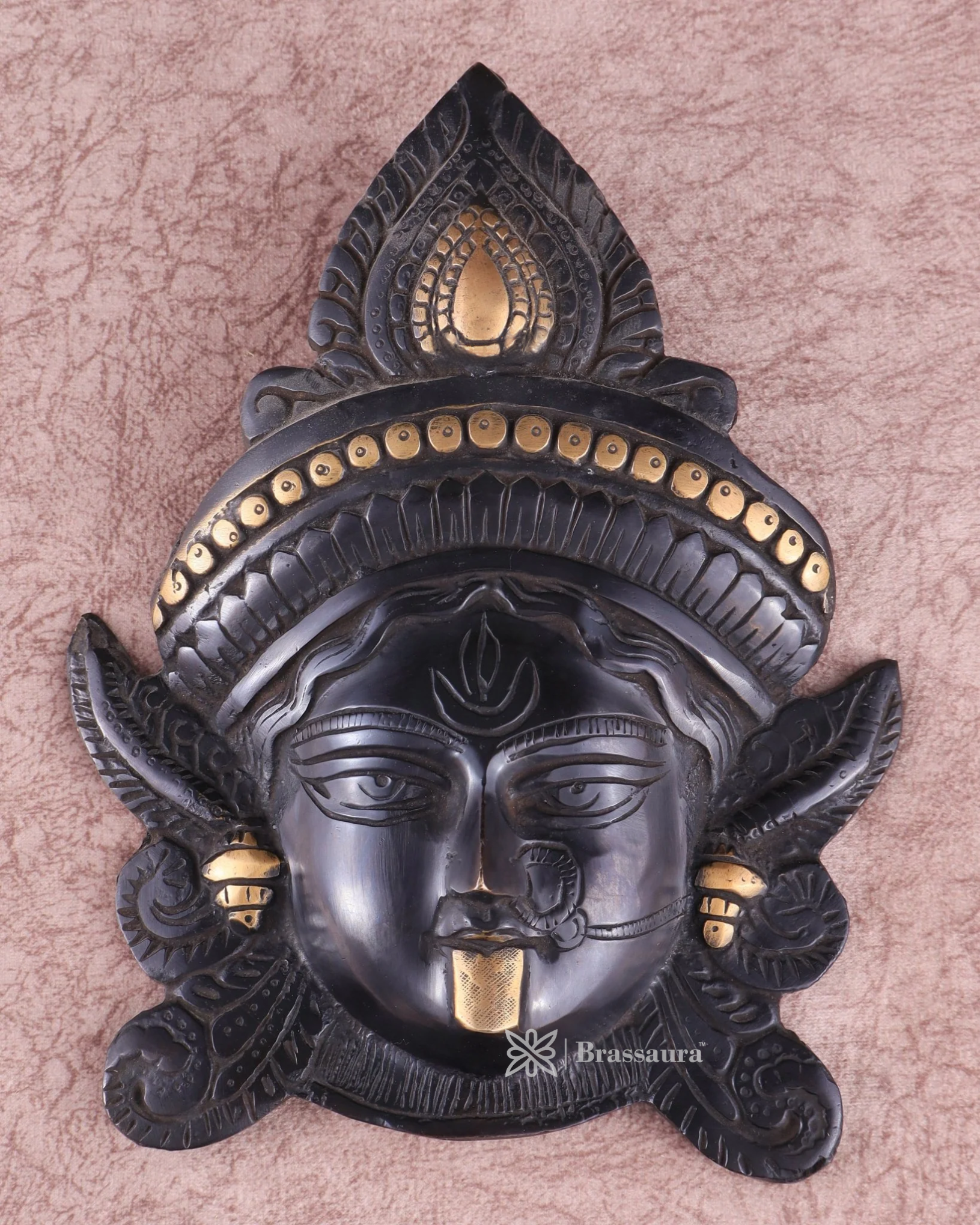 Designed with a black finish for a bold and elegant look, this brass face mask features a built-in wall mount, allowing easy placement on doors, walls, or in your puja room using a simple nail.