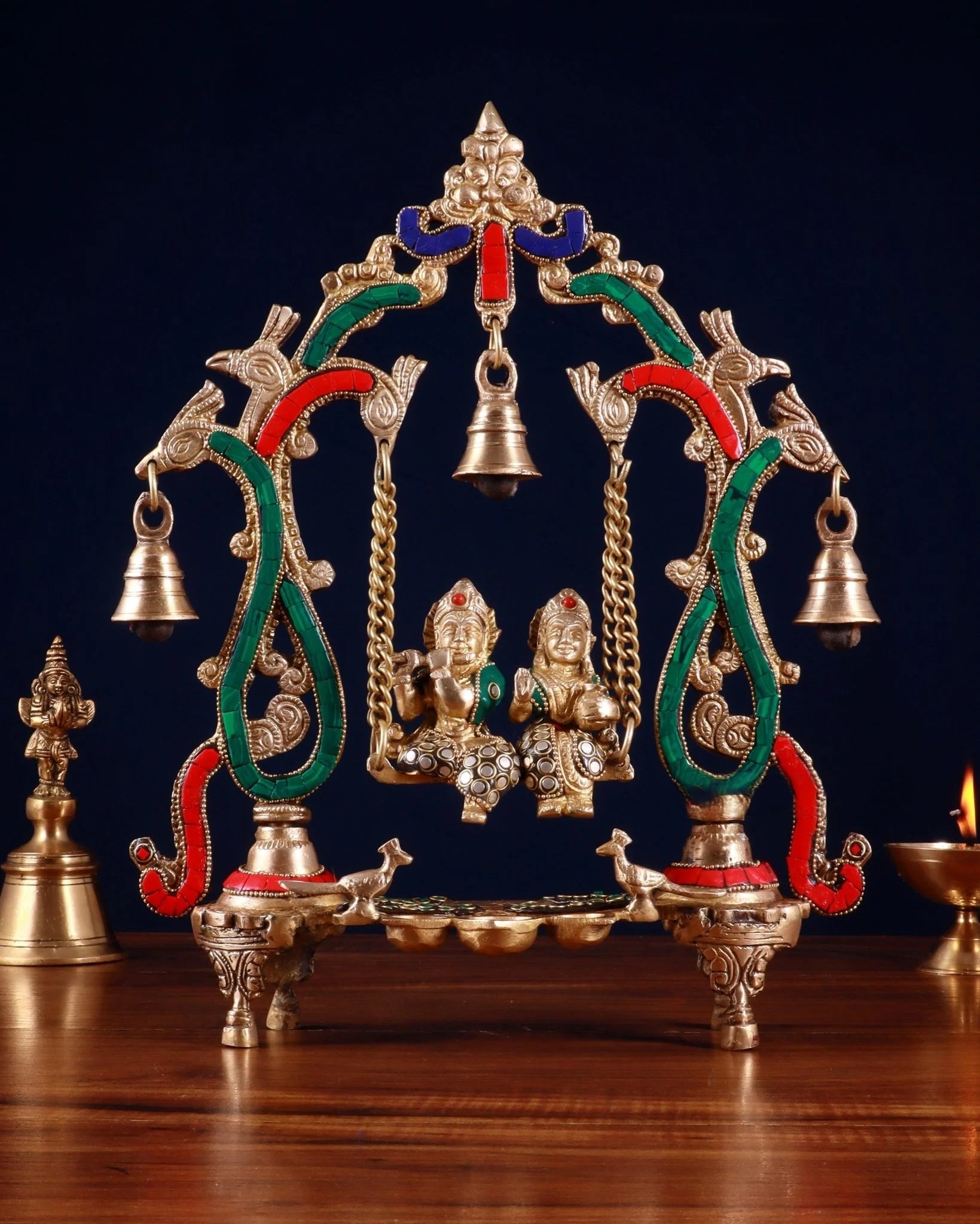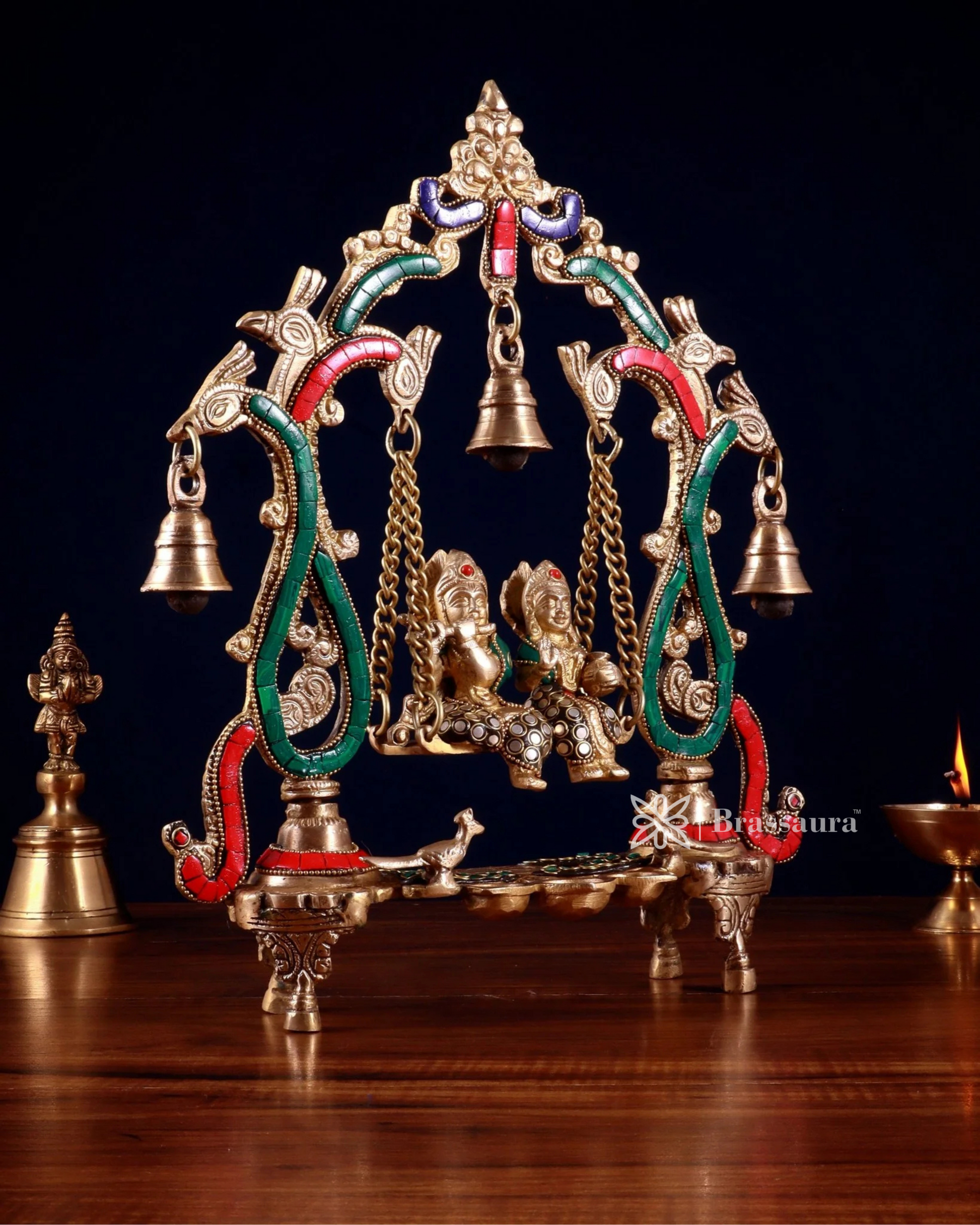 Enhance your sacred space with the divine presence of Radha Krishna on a swing adorned with three diyas. This shiny, handcrafted brass swing features six peacocks and three hanging bells, showcasing intricate detailing that adds elegance and spiritual charm to your décor.