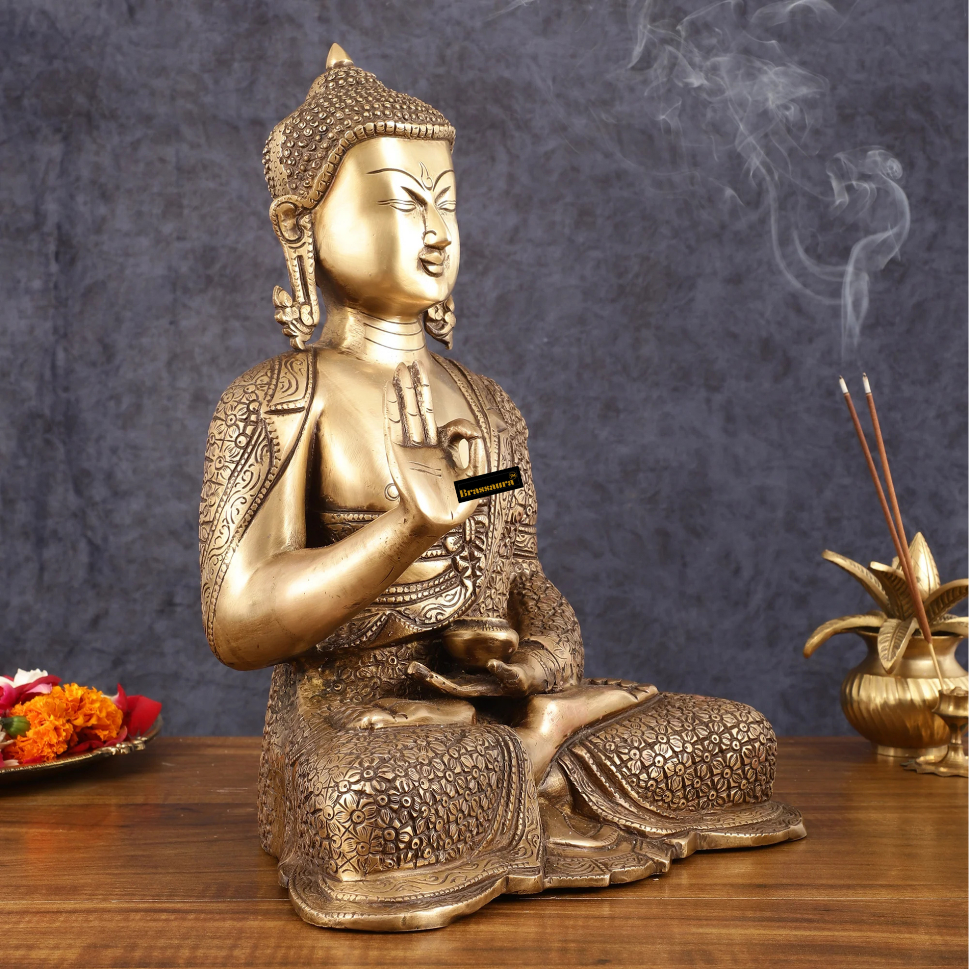 Evoke serenity in your space with this Antique Burnt Brass Finish Buddha Idol. Crafted with meticulous care, this 15-inch masterpiece measures 12 inches in width and 10 inches in depth, weighing 14.01 Kgs. It adds a calming and elegant touch to your home, meditation corner, or sacred décor.