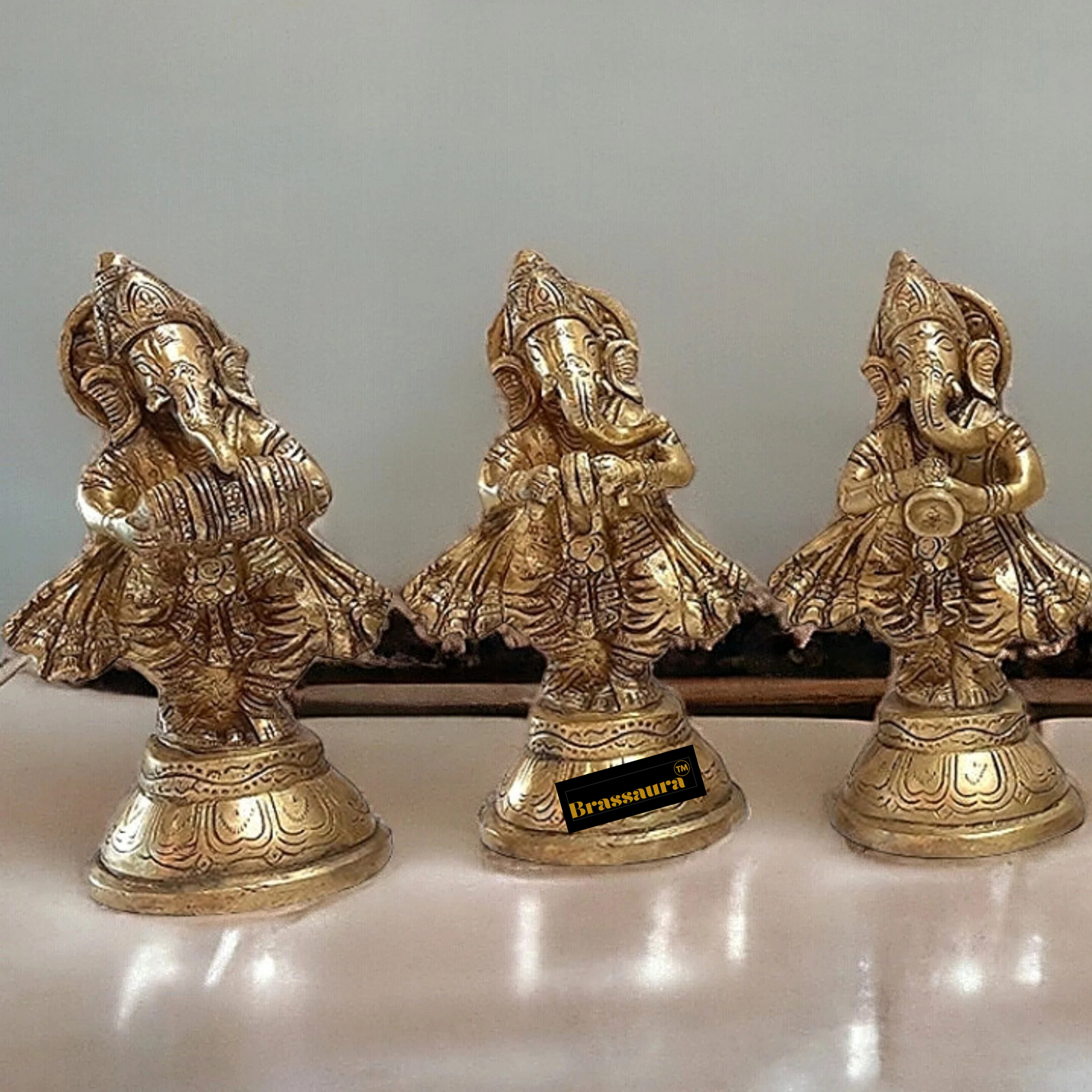Brassaura™ Pure Brass Musician Ganesha Set of 6 – Height 6 Inches Each, Total Weight 4.5 Kgs