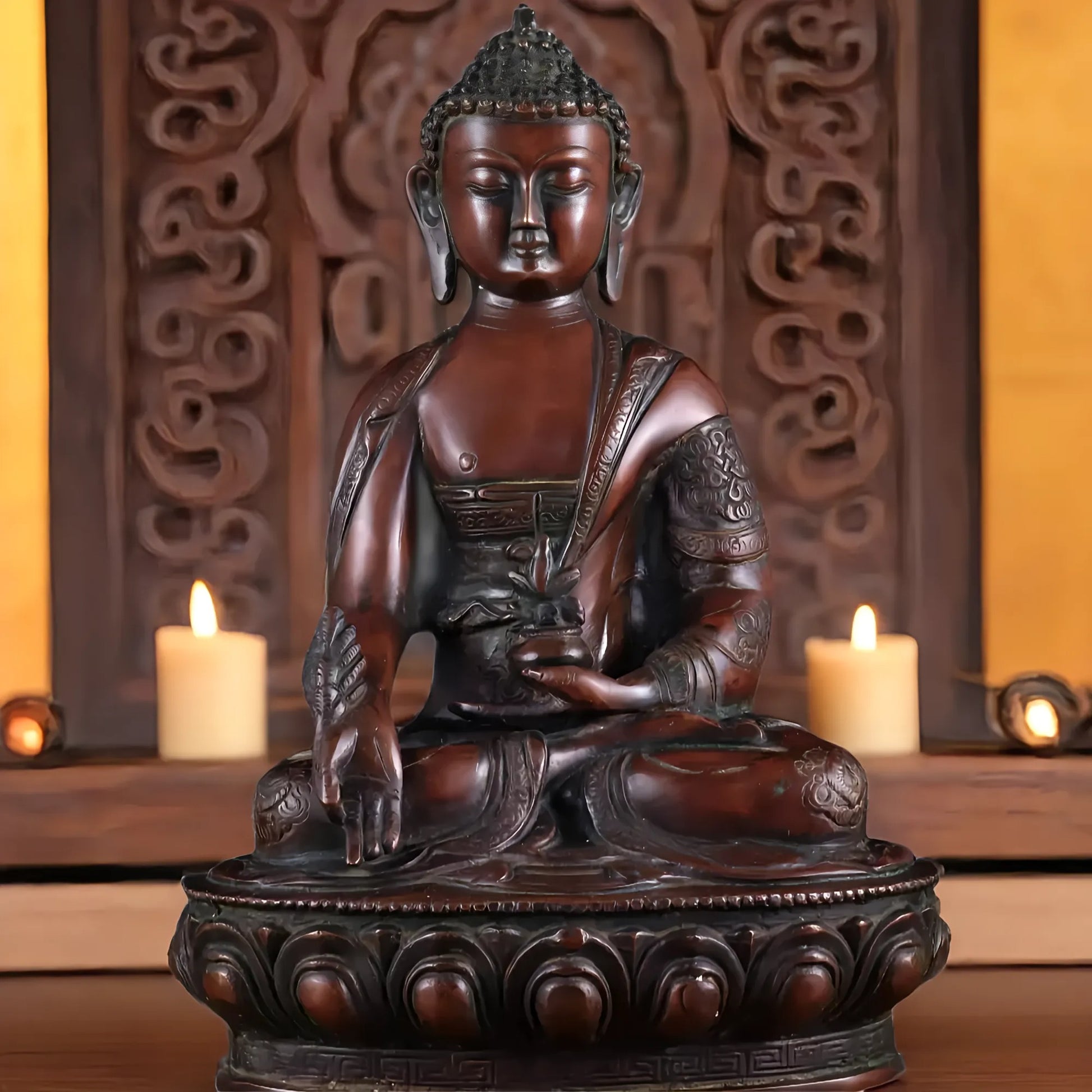 Brassaura™ Pure Brass Medicine Buddha Statue | Antique Tone Handcrafted Décor | Weight 4.58 Kgs | Height 12 Inches