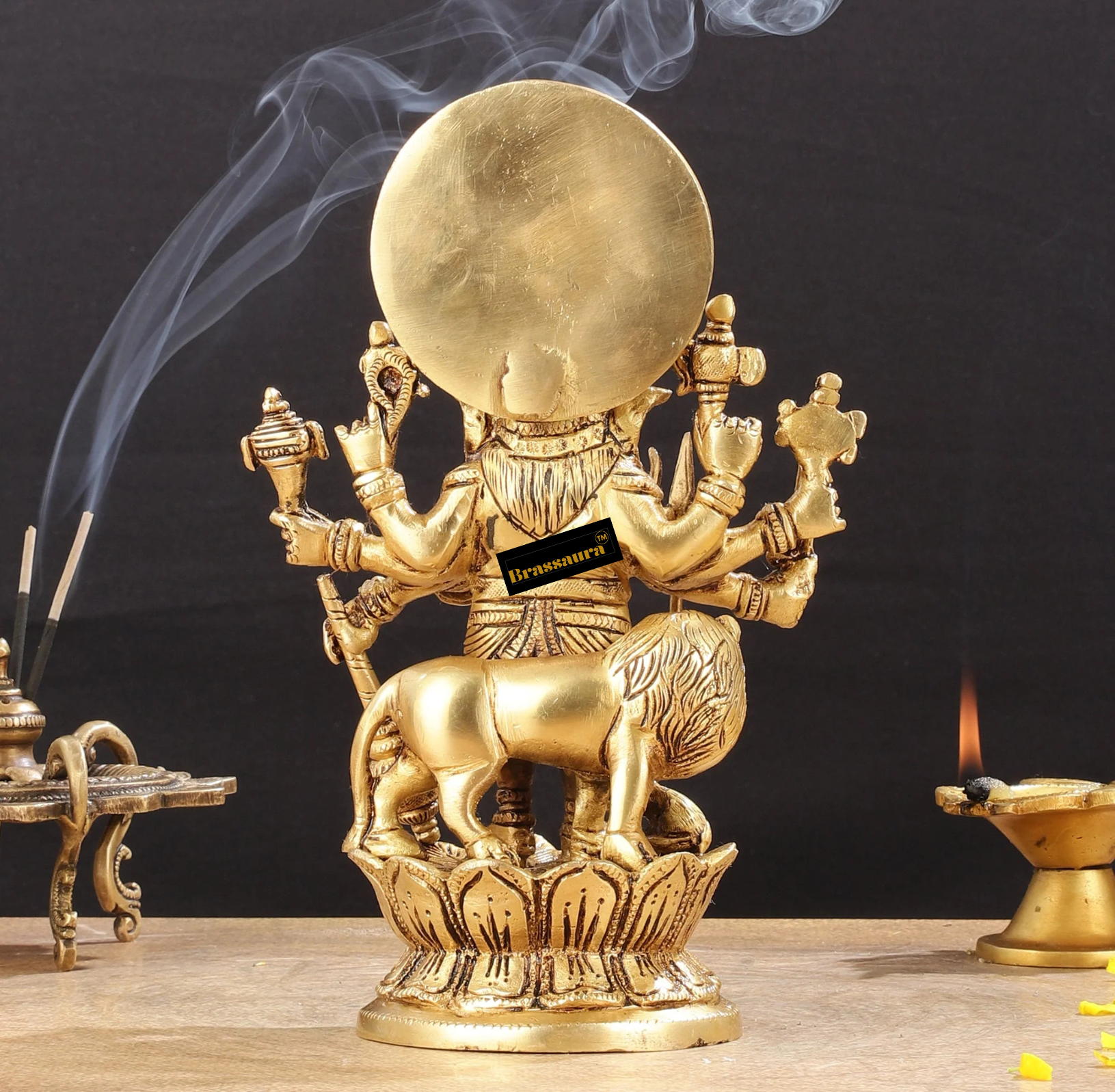 Embrace divine protection with this 8-inch brass Kanadrishti Ganesha idol, featuring a majestic lion. Standing 8 inches tall, with a width of 5.5 inches and depth of 3.5 inches, and weighing 2.6 kgs, this finely crafted idol symbolizes strength, courage, and auspicious blessings. Perfect for home temples, office décor, or as a thoughtful gift.