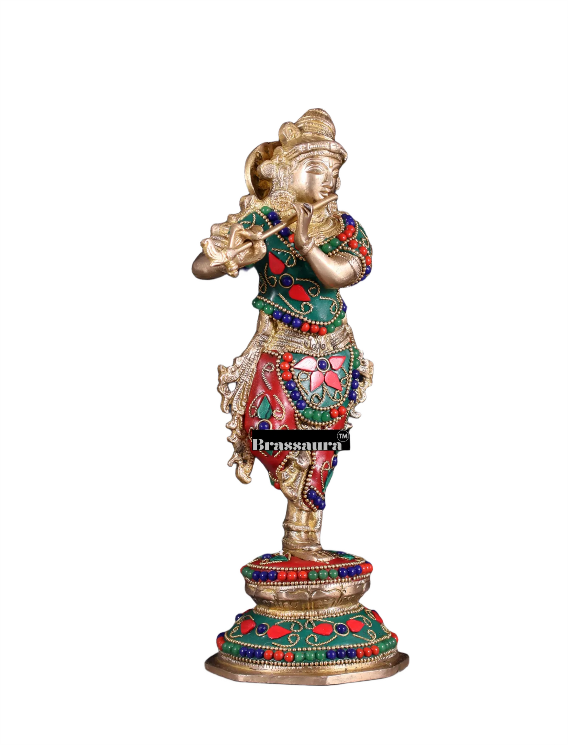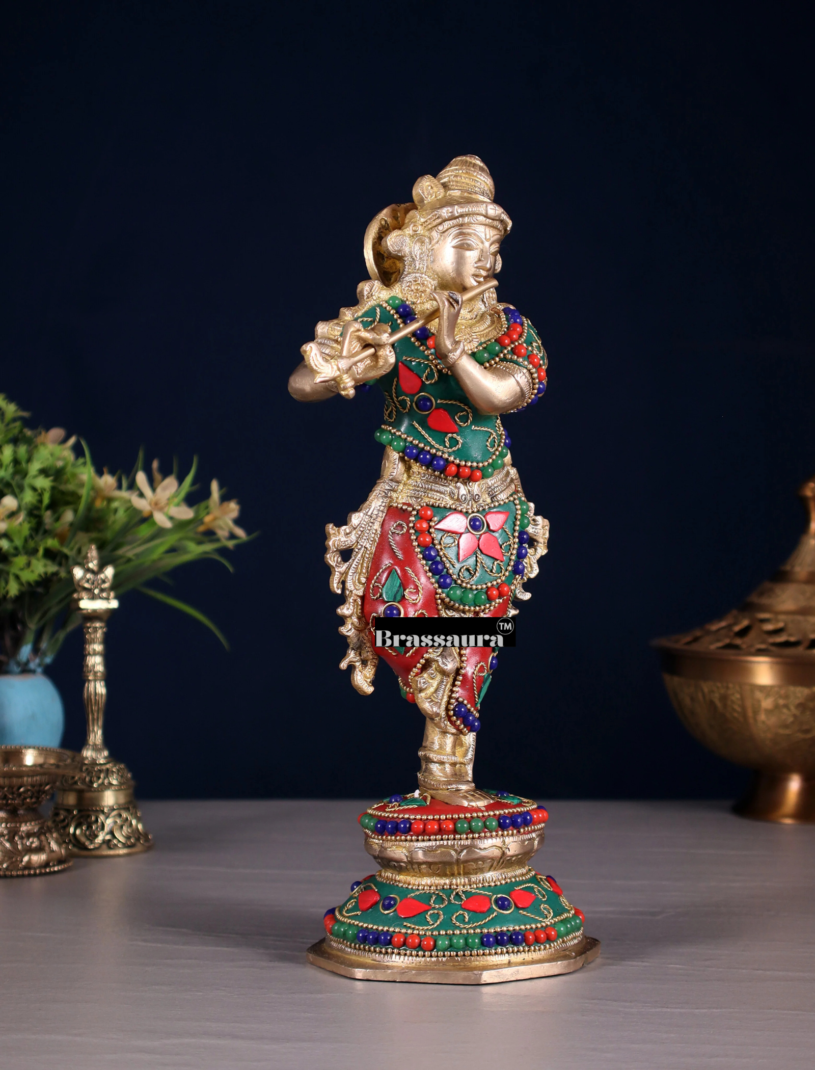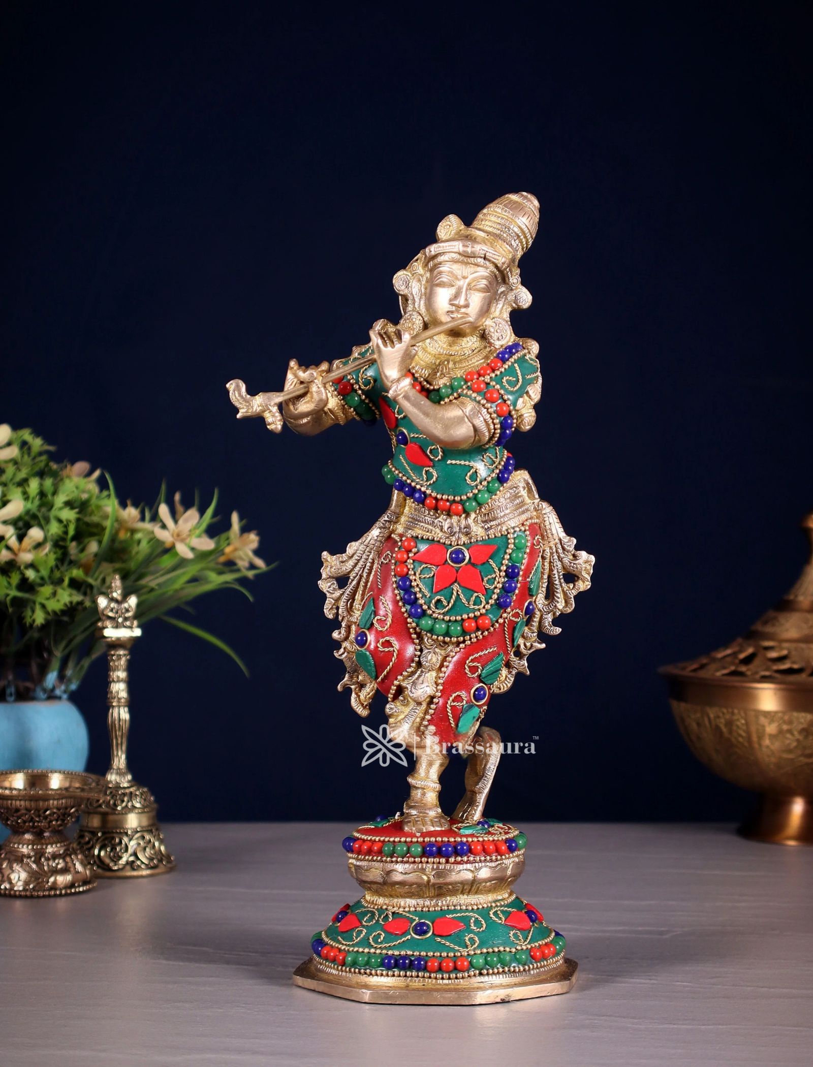 BrassAura™ Unique Brass Krishna Statue – Floral Stonework Design | Height 9.5 Inch | Weight 2 Kg