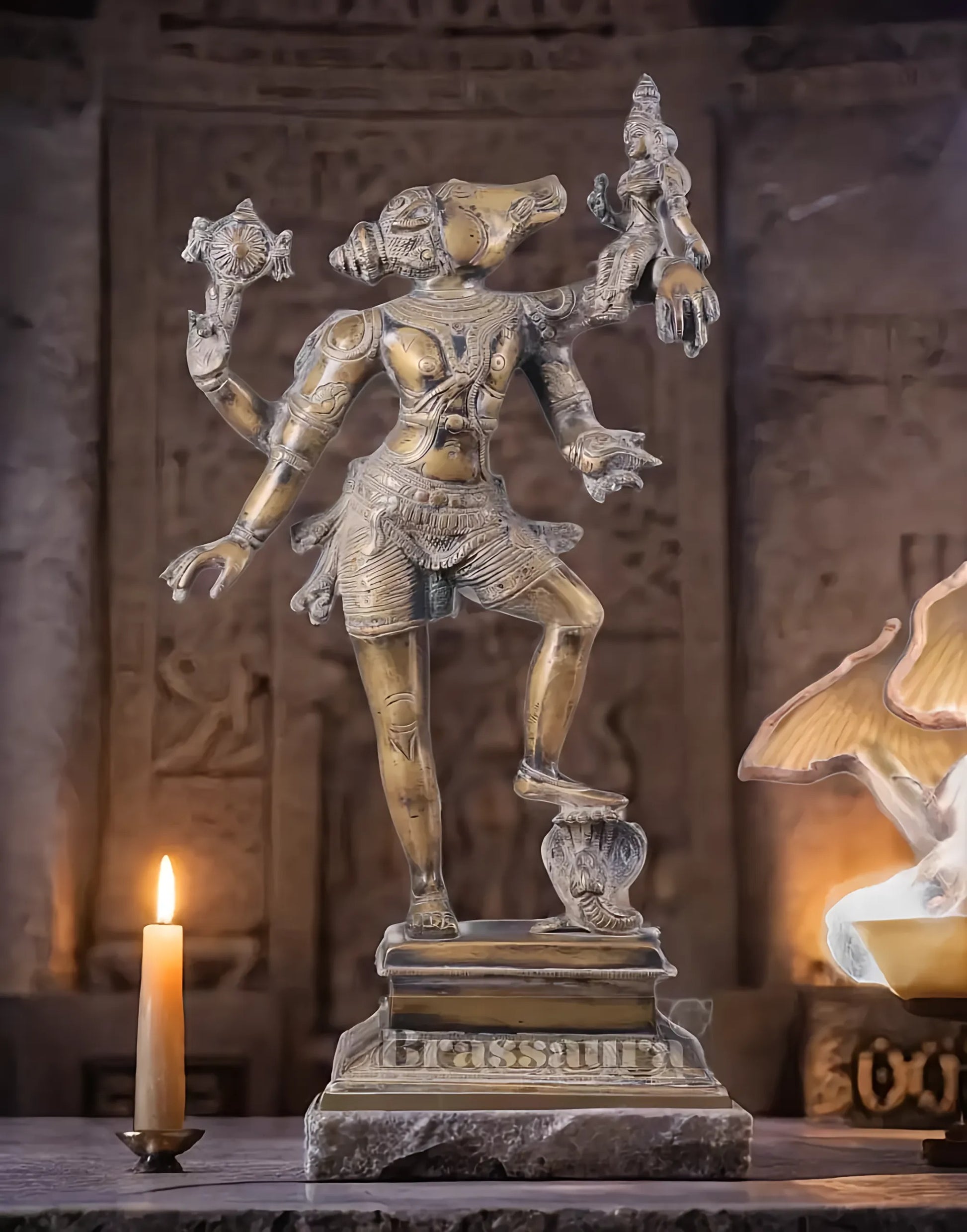 This Brassaura™ handcrafted pure brass idol beautifully depicts Lord Varaha, the powerful boar-headed avatar of Lord Vishnu, lifting Goddess Bhooma Devi, the Earth Goddess, from the depths after defeating the demon Hiranyaksha. A divine symbol of restoration, protection, and cosmic order, this sacred sculpture is perfect for any pooja room, temple, or spiritual setting.