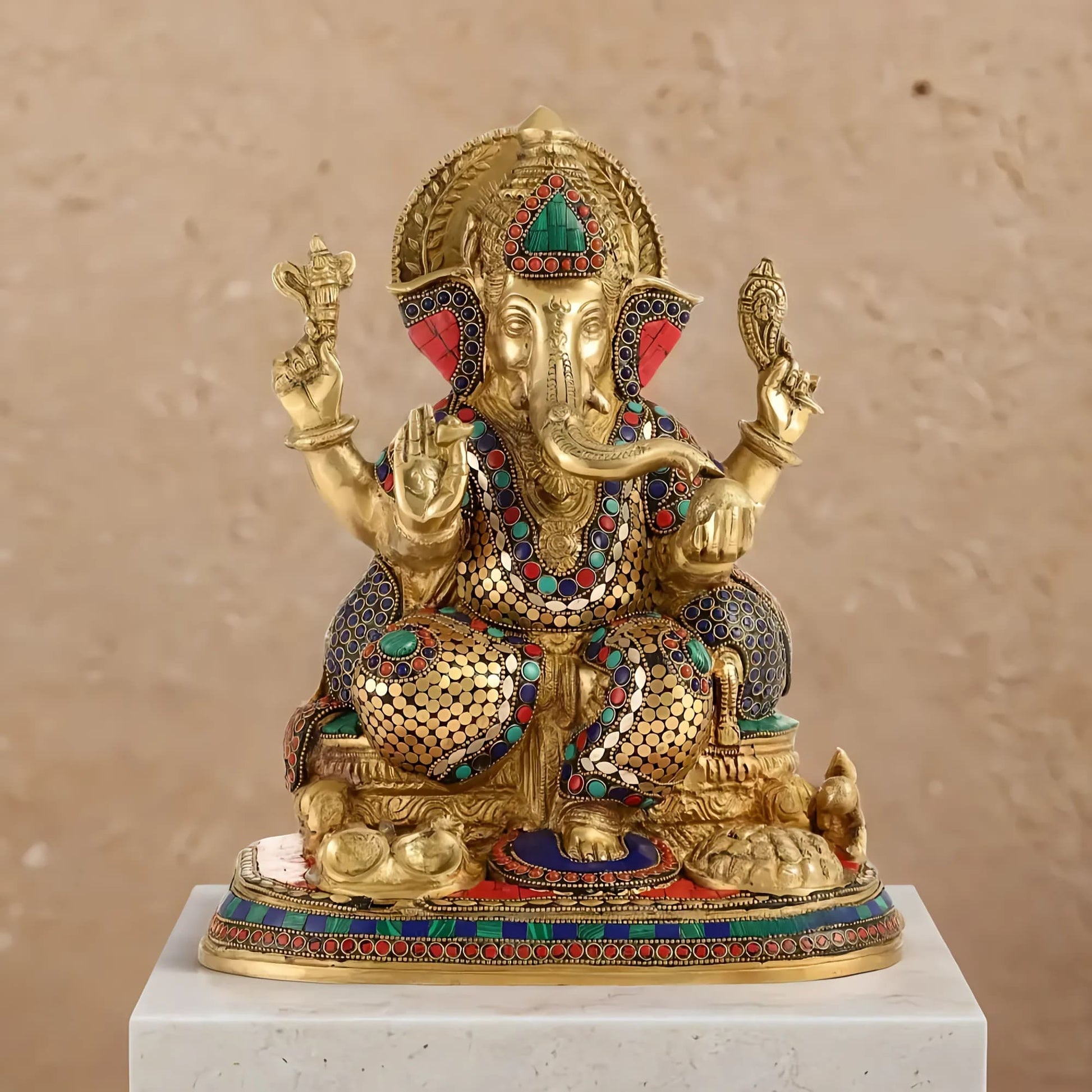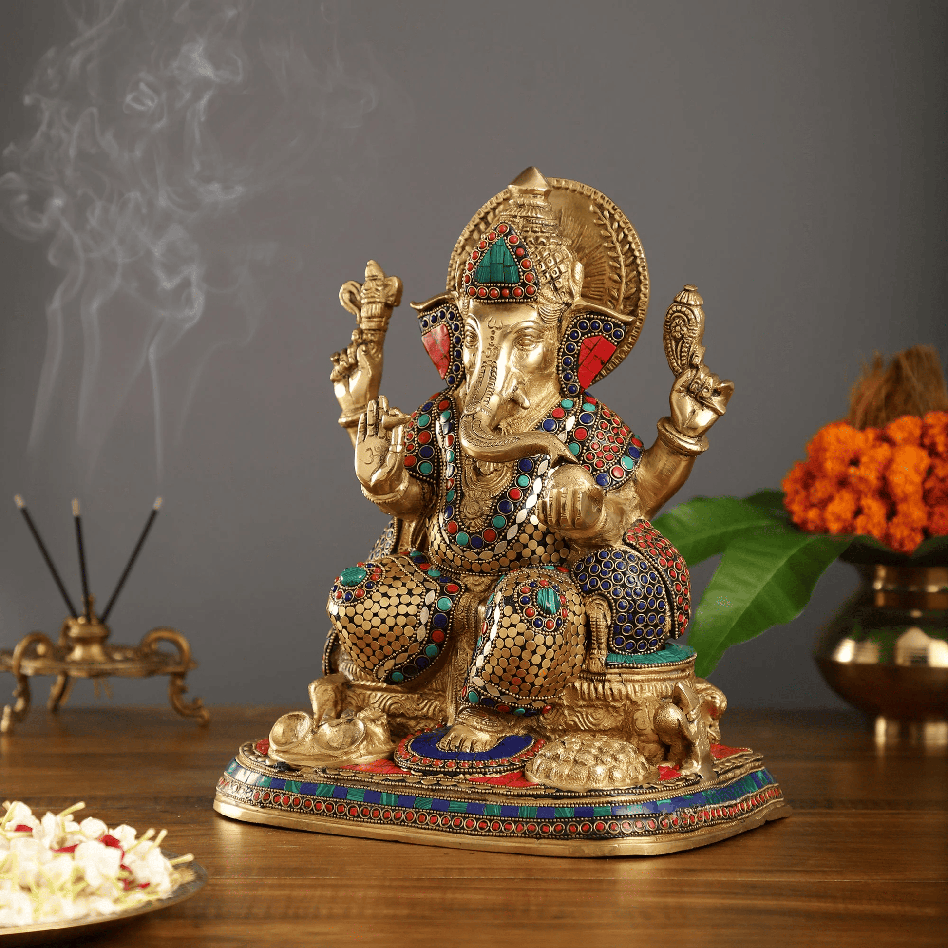 Brassaura™ Superfine Brass Ganesha Idol with Fruit Bowl & Modak Thali | Intricate Stonework | Height 13 Inches & Weight 12 Kgs