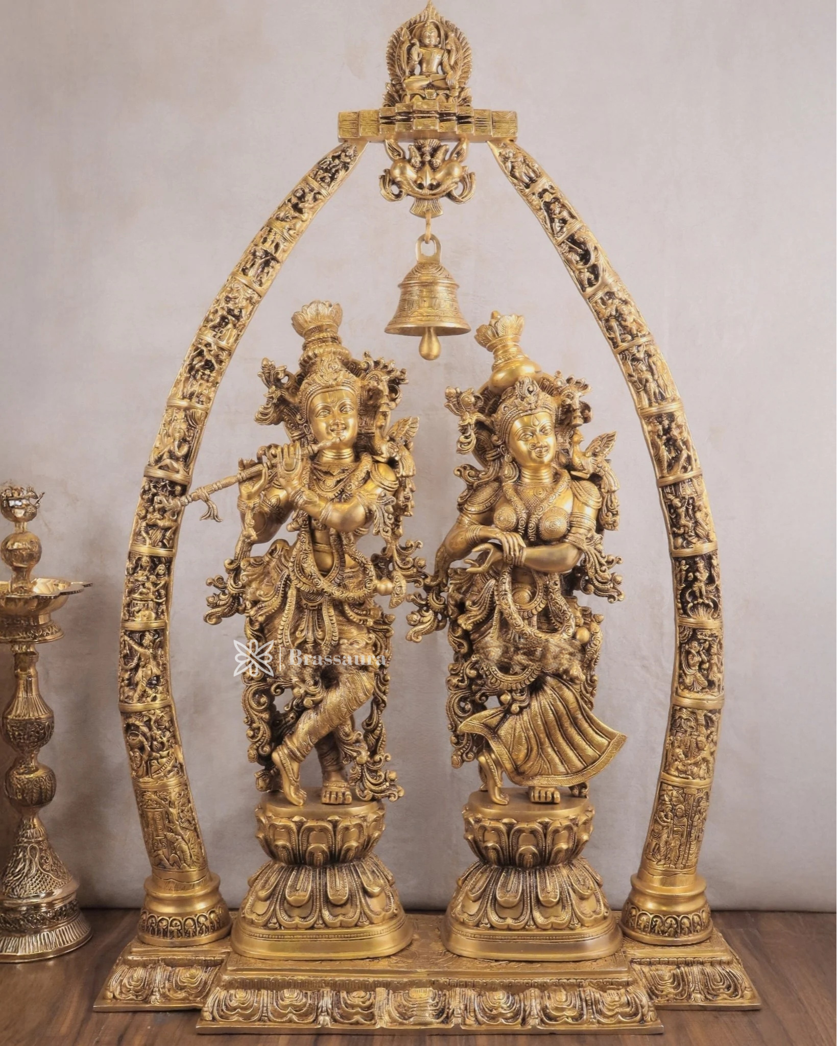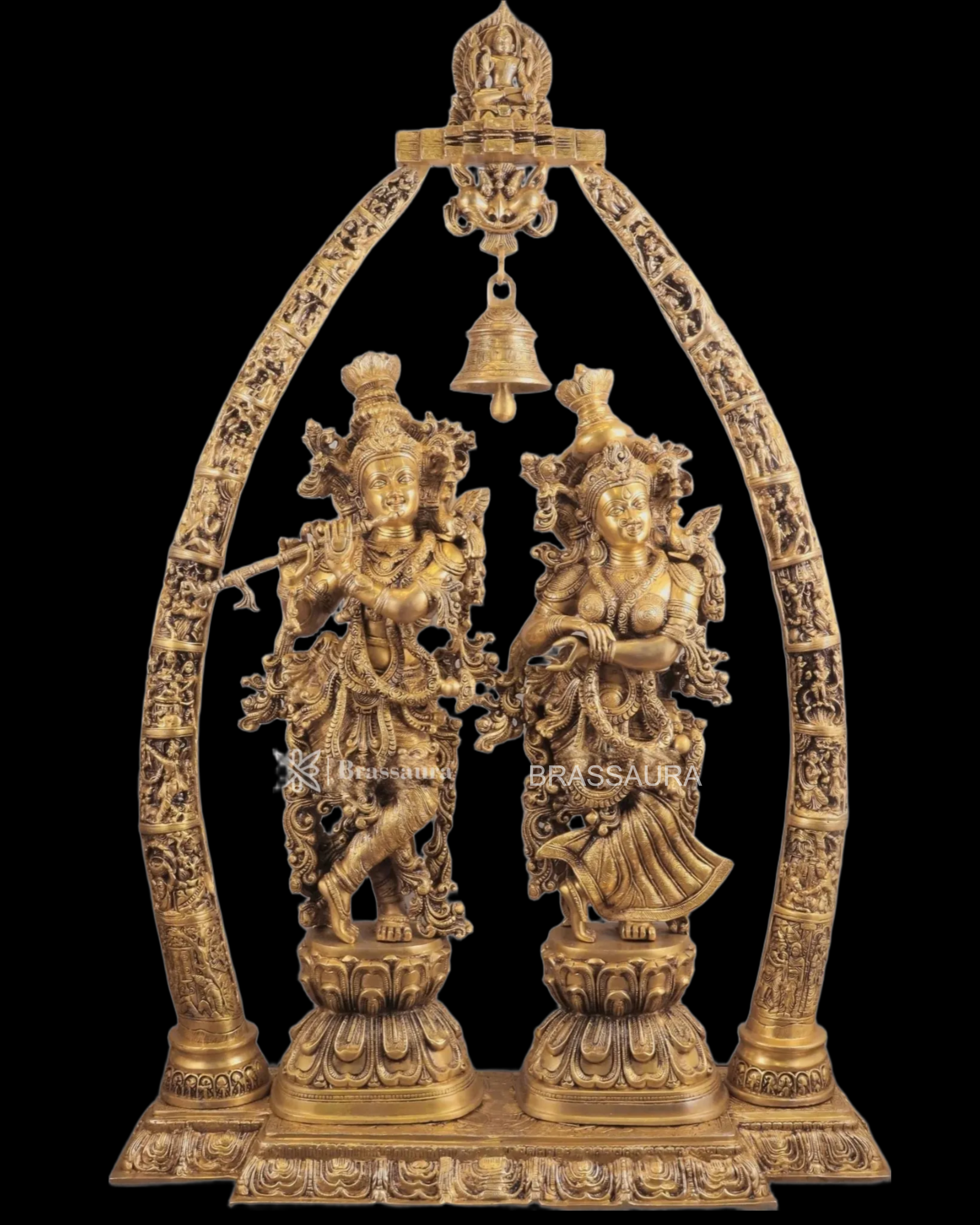 Brassaura™ Magnificent Brass Radha Krishna Temple Arch with Krishna Leelas – Arch Height 45 Inches & Total Weight 70 Kgs | Elegant Devotional Masterpiece