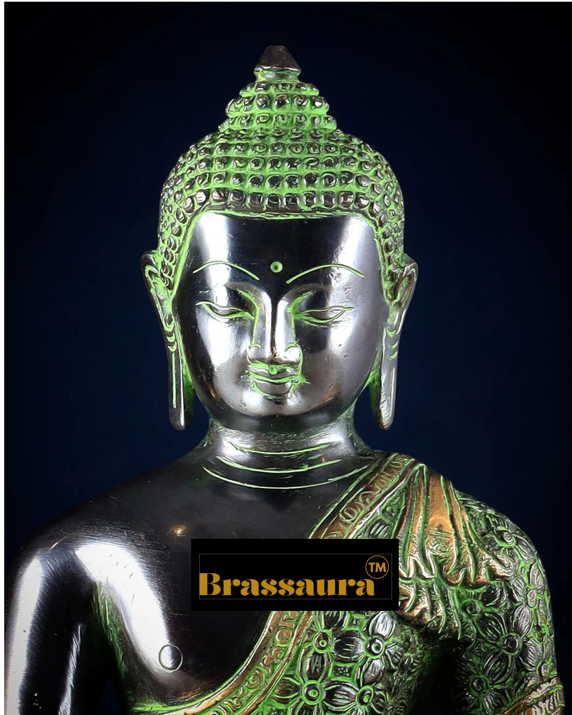 Enhance your space with this Pure Brass Buddha Idol in an exclusive three-tone finish of black, green, and gold. Standing 13 inches tall, 10 inches wide, and 6.5 inches deep, and weighing 6.66 Kgs, it radiates serenity and elegance, making it ideal for home décor or meditation spaces.