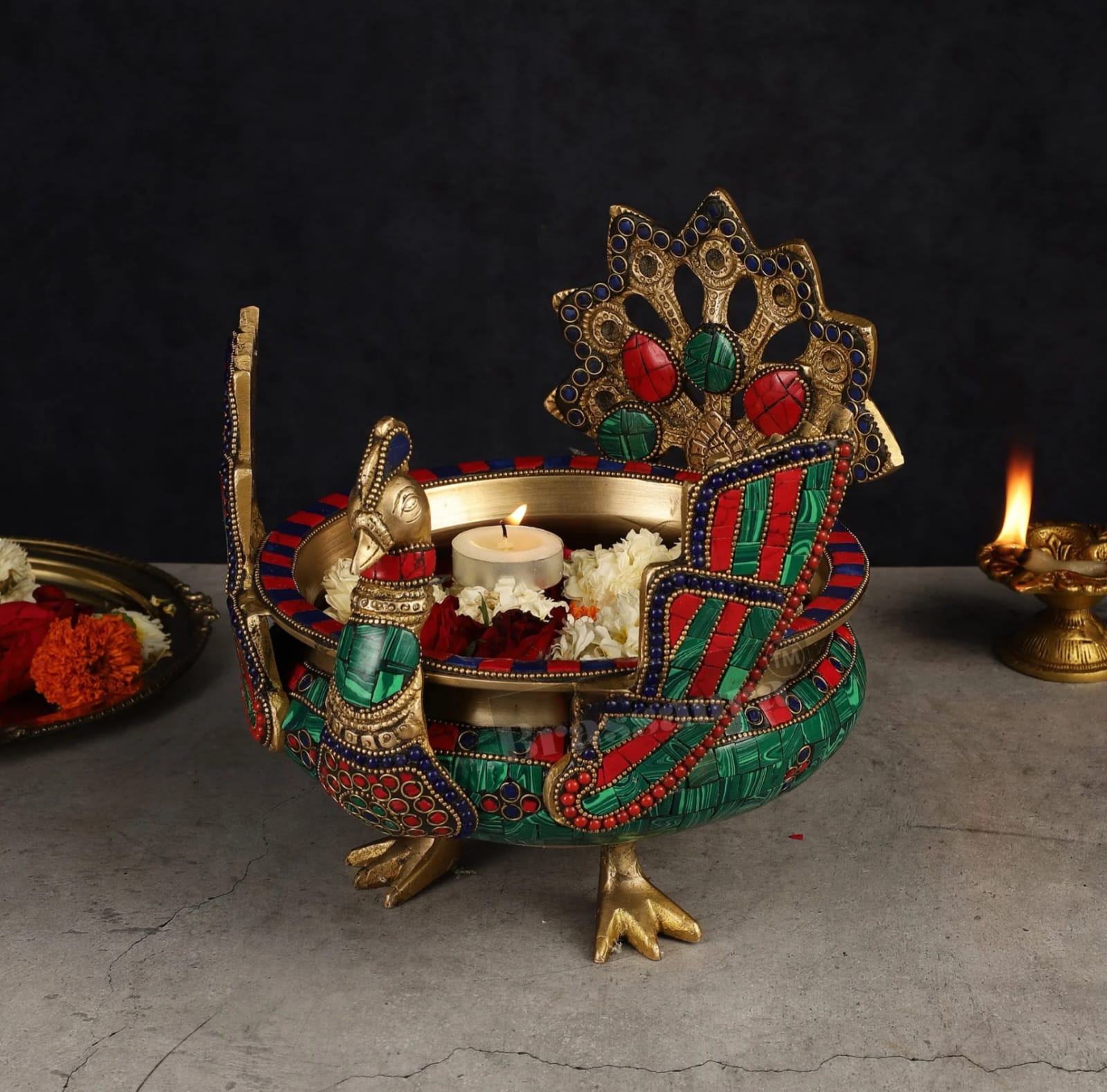 Brassaura™ Brass Peacock Shaped Urli Bowl with Stand – 2 kgs, 9 Inches Height – Elegant Handcrafted Home Decor