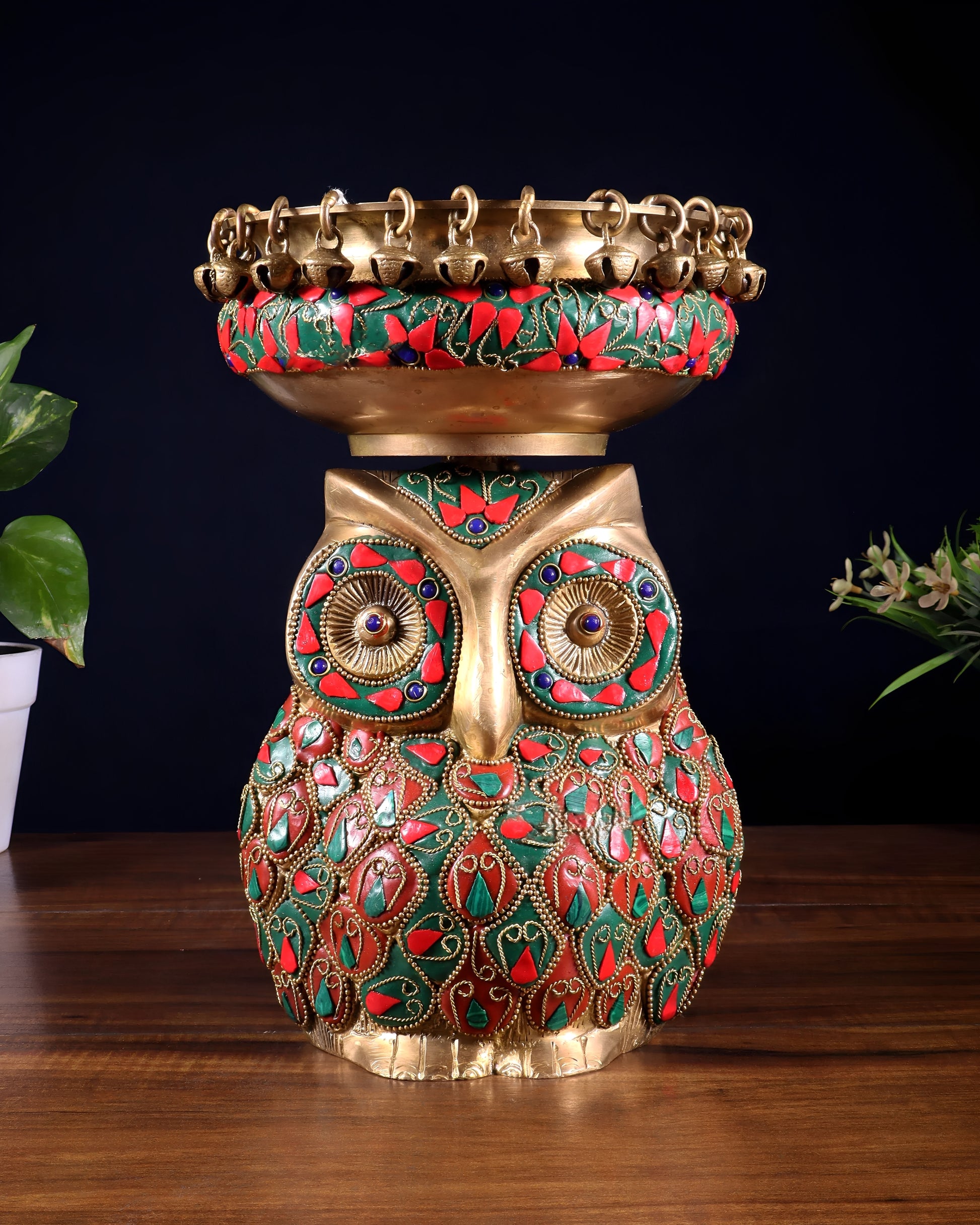 Brassaura™ Brass Urli with Large Owl Adornment | Nepalese-Style Stonework | Height 10 Inches & Weight 4.15 Kgs