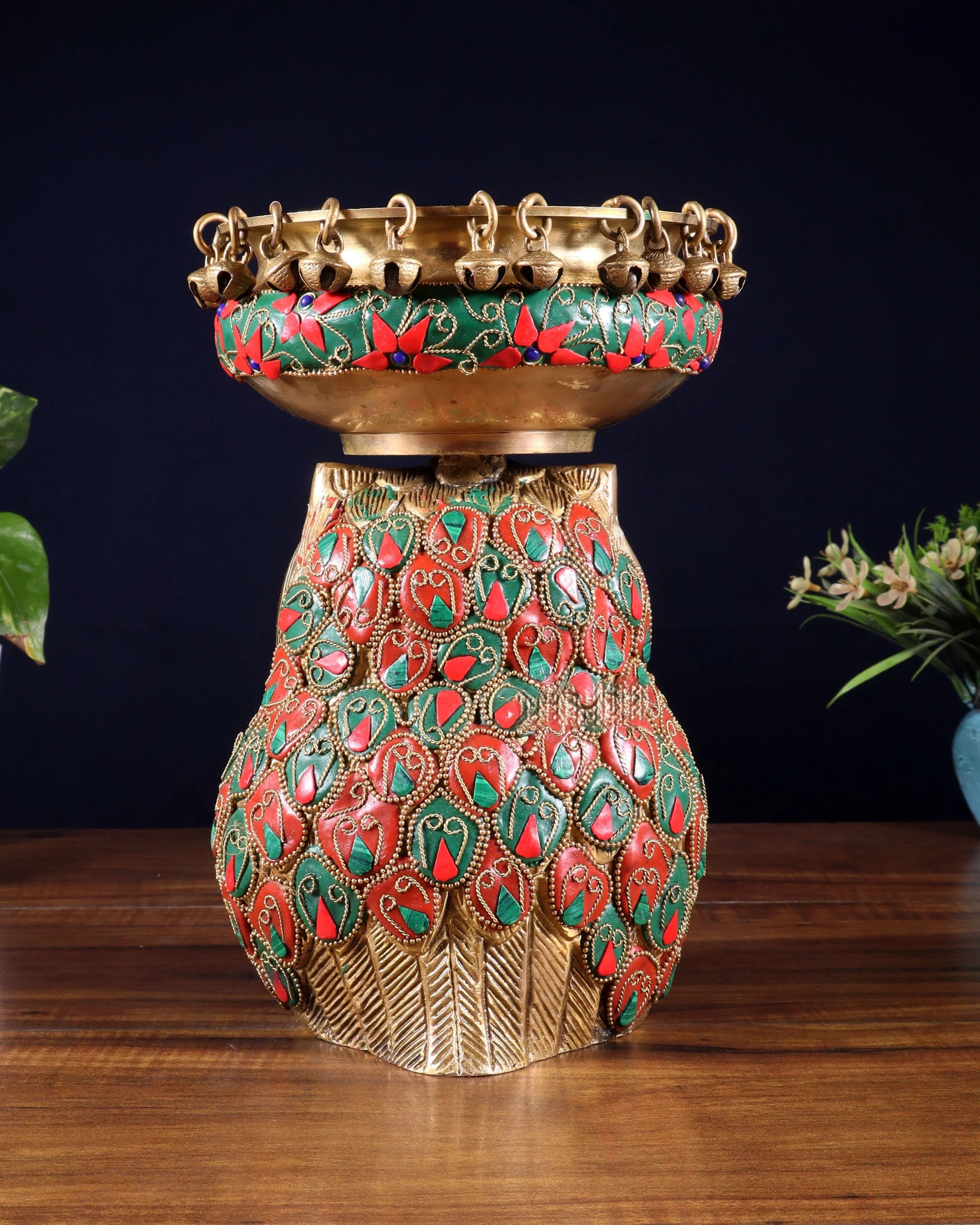 Bring charm and auspicious energy to your space with this handcrafted brass urli featuring a large owl motif in Nepalese-style stonework. Perfectly blending functionality and artistry, it is ideal for floating flowers, candles, festive décor, or gifting. The owl symbolizes wisdom and prosperity, making this urli both a decorative and meaningful accent for your home.