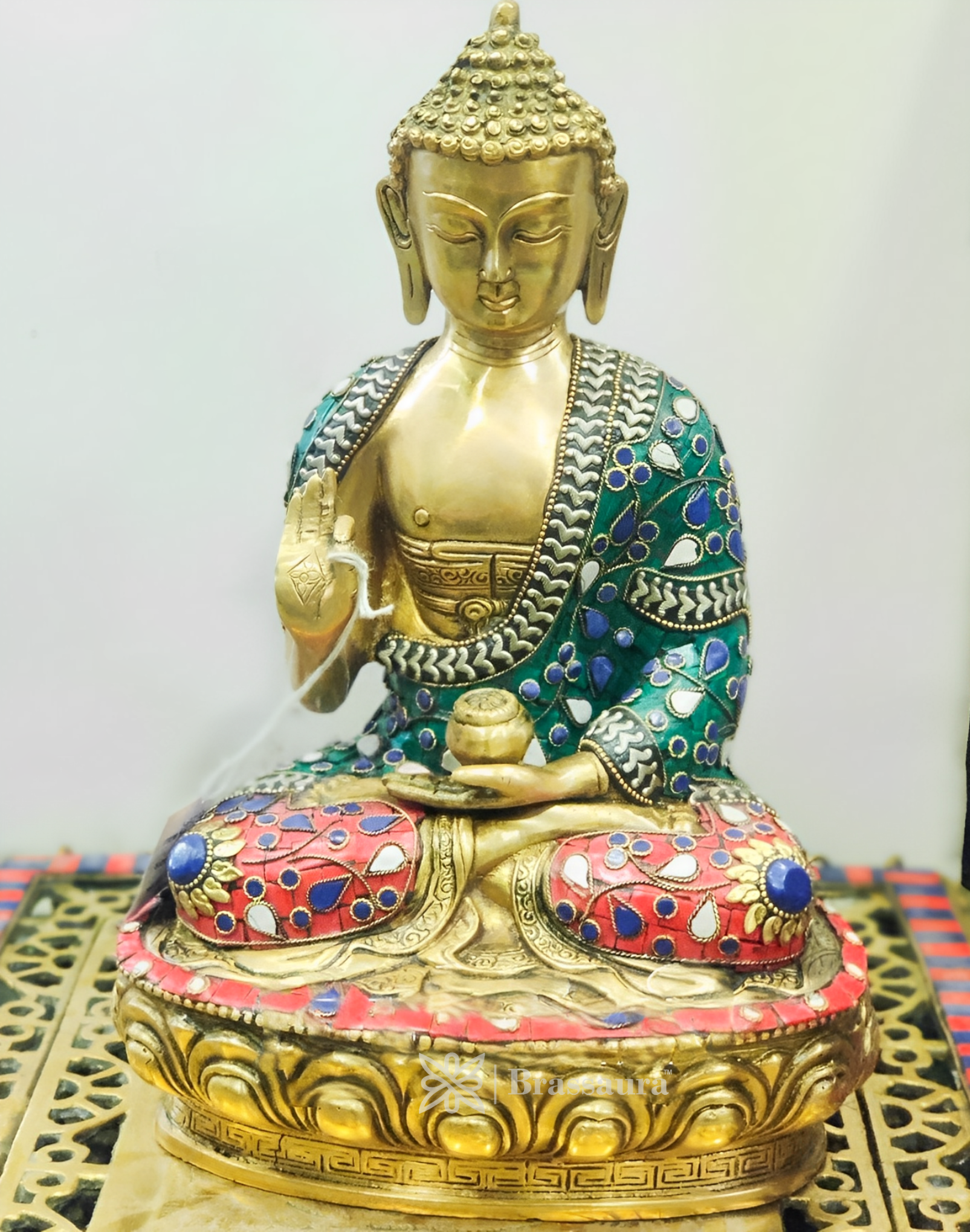 Discover the serenity and spiritual significance of this finely handcrafted Brass Buddha Statue, depicting Lord Buddha in the Bhoomisparsha Mudra with a medicine bowl. Symbolizing the moment of enlightenment, Buddha touches the Earth, embodying wisdom, peace, and spiritual awakening. Adorned with natural stones across the statue, this 10-inch tall masterpiece exudes grace and tranquility, making it a perfect addition to your meditation space, home décor, or temple.