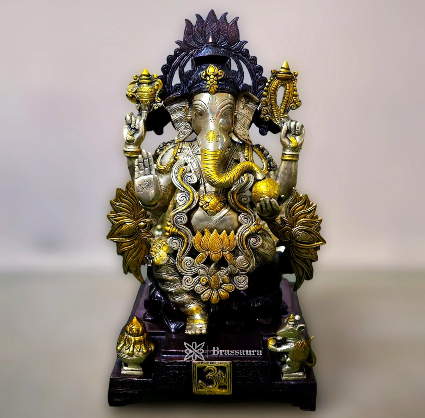 Brassaura™ Pure Brass Ganapati on Lotus Sculpture – 25 Inch Height | 33 Kg | Unique Design for Home & Temple Decor