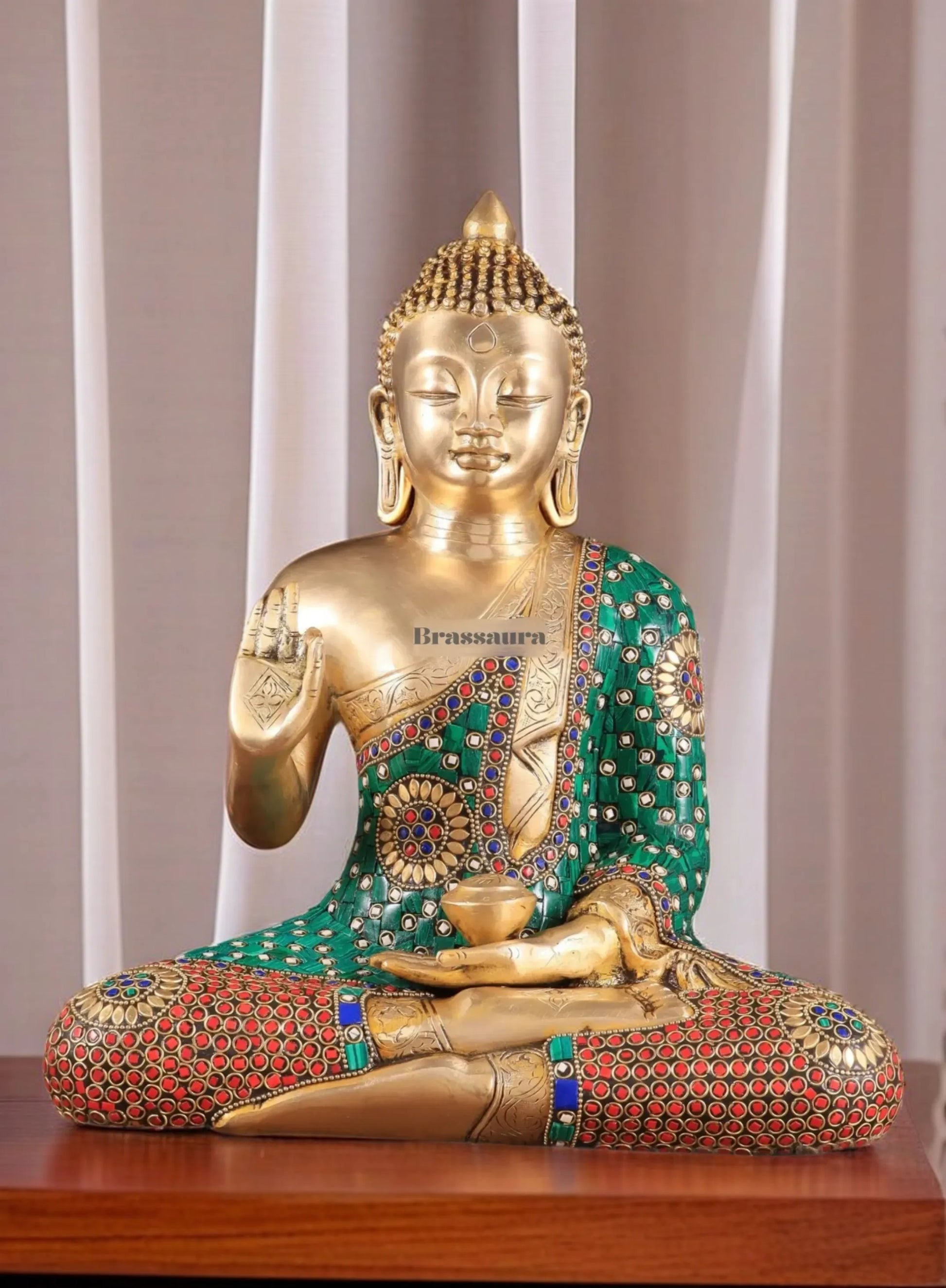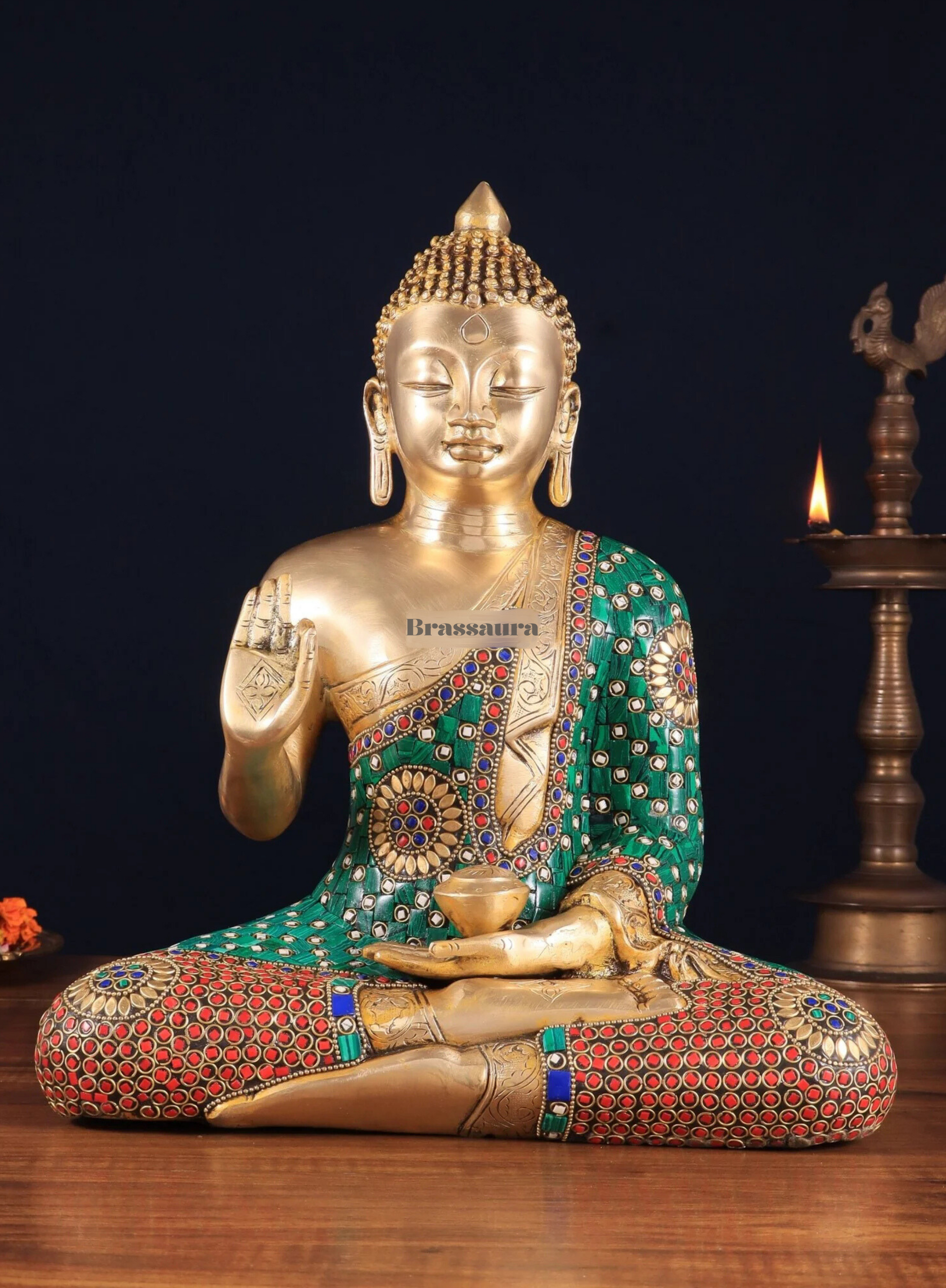 Brassaura™ Brass Buddha Statue in Abhaya Mudra – Height 14 Inches, Weight 8 Kgs