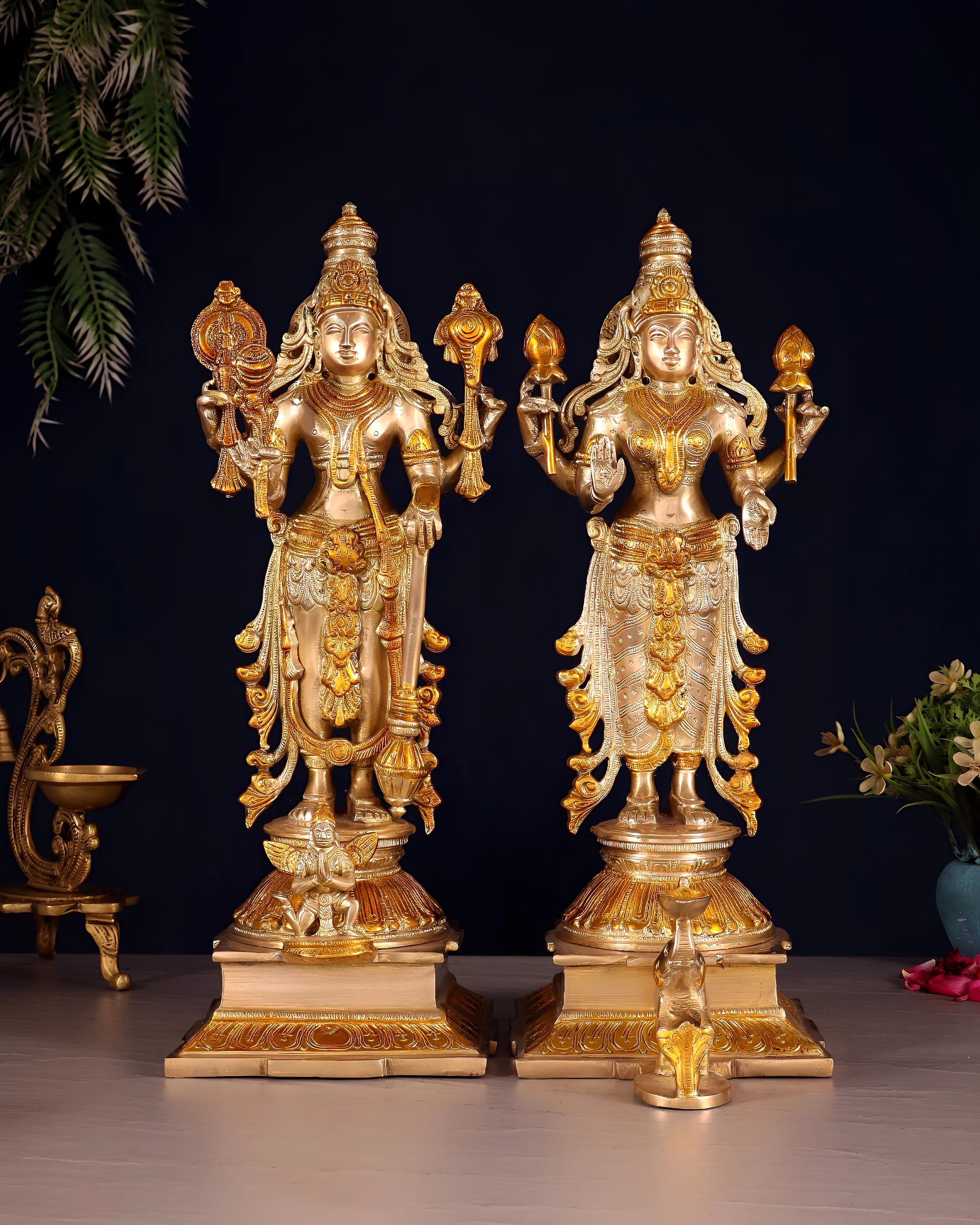 Each idol stands tall at 14 inches, showcasing intricate detailing that reflects the rich heritage of South Indian sculpture. Perfect for home temples or sacred spaces, this set invites blessings, prosperity, and spiritual harmony into your surroundings.