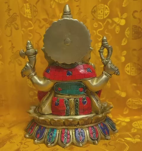 Brassaura™ Brass Lord Ganesha on Lotus Idol with Meenakari – Height 11 Inches, Weight 7 Kgs
